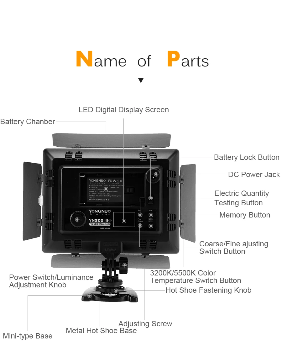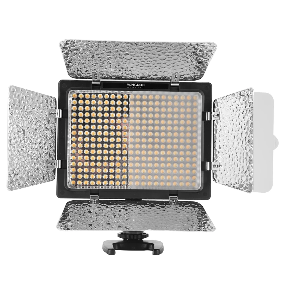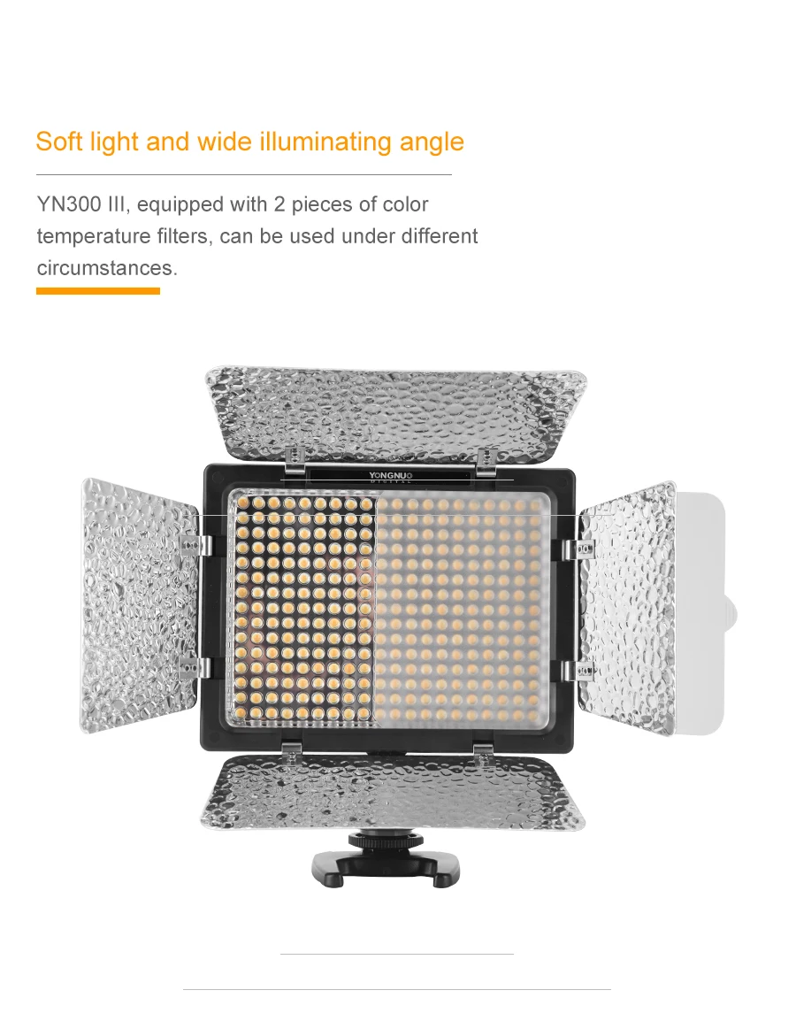 3.YN300 III состоит из 150 светодиодный ламповых бусин с цветовой температурой 3200k и еще 150 светодиодный ламповых бусин с цветовой температурой 5500k, которые являются высококачественными ламповыми бусинами сверхбольших светящихся чипов, С более высокой яркостью в одинаковом энергопотреблении. Цветовая температура может быть скорректирована с 3200-5500K по мере необходимости, с более практичным использованием.