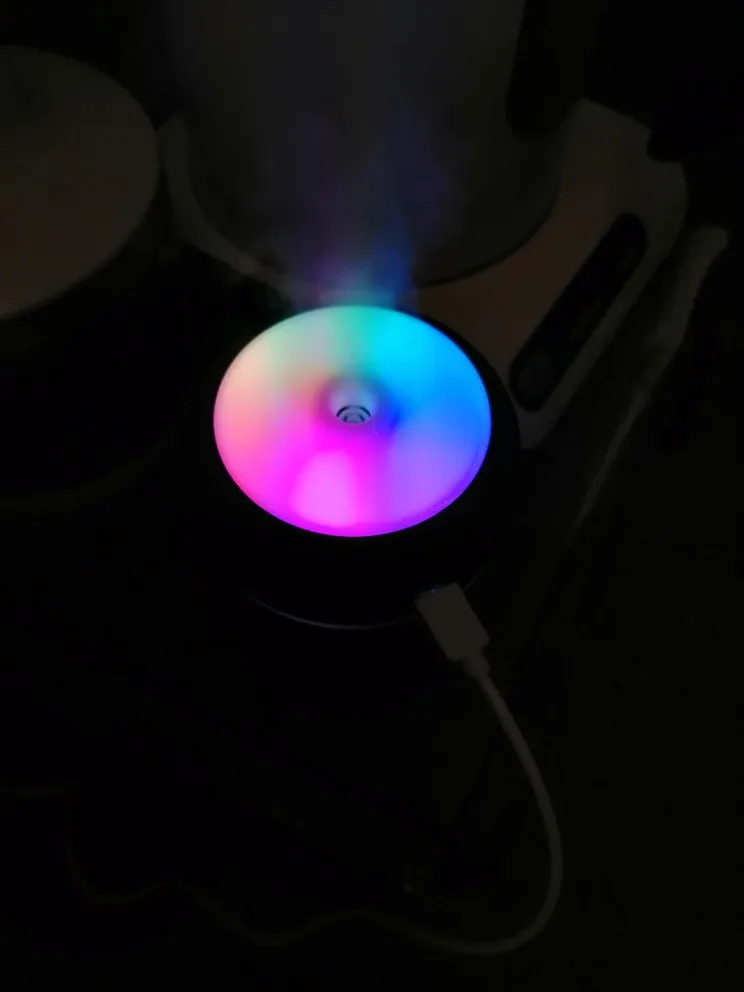 Теперь у меня есть личная аквадискотека. Для увлажнения большой комнаты маловат, конечно, но чтобы поставить на рабочий стол подходит отлично. Подсветка есть разноцветная и белая, можно ее выключить вообще. Объём 300мл, немного больше обычной чашки для чая. Один фильтр есть в комплекте. Доставка до Ленобласти 14 дней