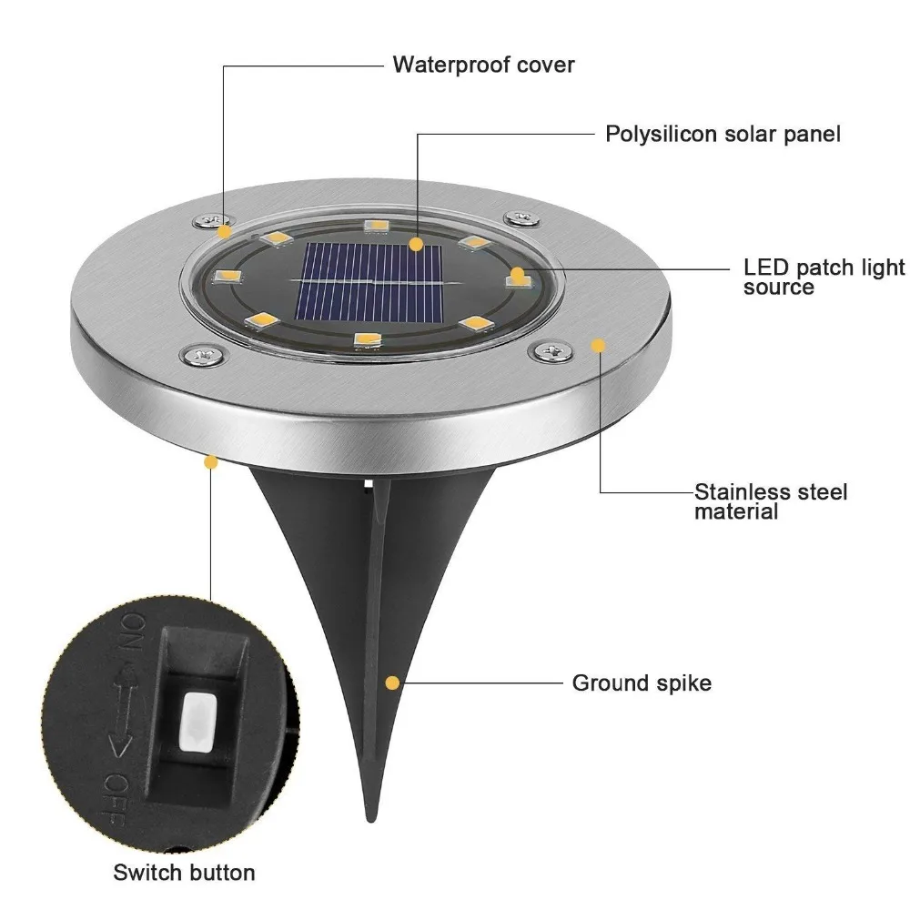 Материал: ABS, металлРазмер: 115 мм x 126 ммВес упаковки: 0,2 кгТип: газонный светильник на солнечной батарееСолнечная панель: 2 в 100 мАЕмкость аккумулятора: 600 мА Ni-MHВремя зарядки: около 8 часов солнечного светаУровень защиты: IP65Мощность источника света: 3 ВтРежим работы: индукция управления светом, главный выключательПродолжительность освещения: 8-10 чКоличество бусин: 8/12 штОсобенности:Хорошее качество, длительный срок службы.Профессиональный дизайн.Идеально подходит для дизайна вашего сада.Легко установить и использовать.Мягсветильник позволяет чувствовать себя комфортно.Содержимое упаковки:1/2/4/8 x Солнечный газонный светильникПримечание: Из-за различий между различными мониторами изображение может не отражать фактический цвет изделиям1 см = 0,3937 дюйма