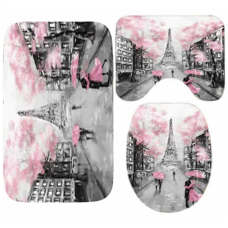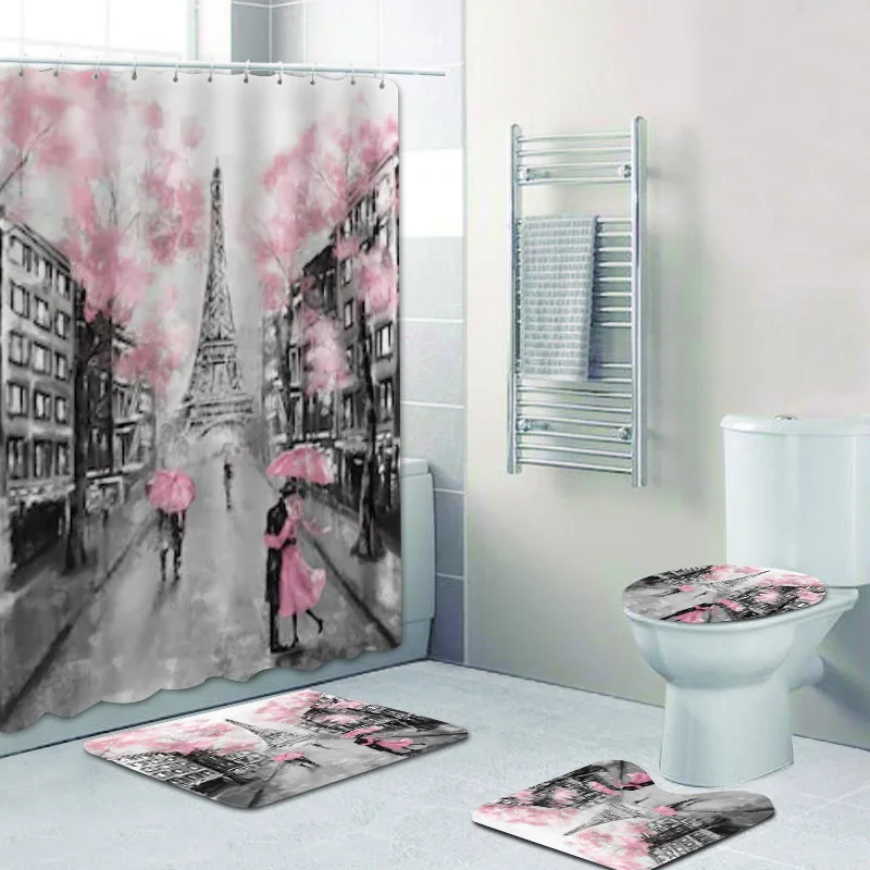 Элегантная розовая душевая занавеска Парижская башня, набор занавесок для ванной комнаты, 3D Цветочный, французский, Парижская живопись, коврик для ванной, ковер, искусство, домашний декор