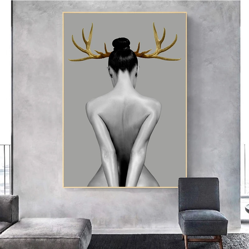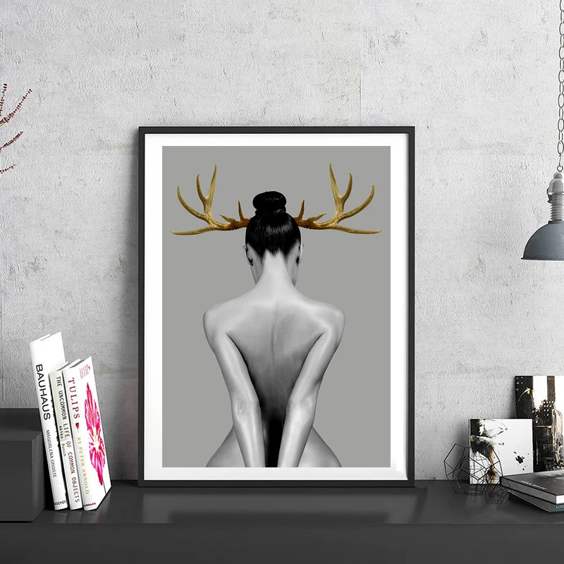 Скандинавские оленьи девочки, холст, живопись, обнаженное искусство, картина, плакат, Золотой олень, женщина, настенные картины для гостиной, современный декор
