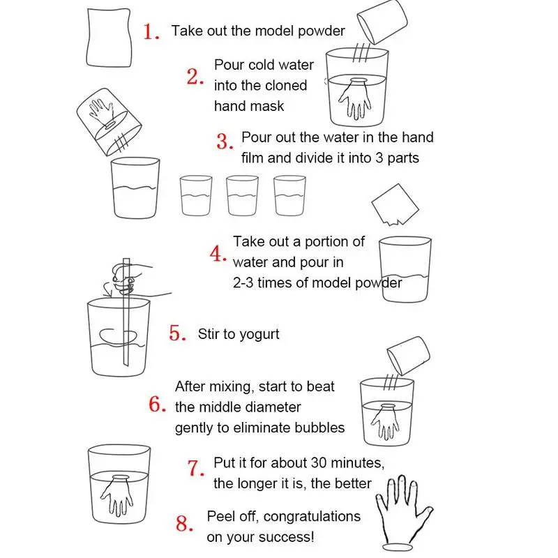 Формовочный порошок смешивается с водой. После того, как форма установится примерно на 75 секунд, ножка или рука ребенка помещаются в формованный контейнер. Качайте ногу ребенка (или руку) из формовочного материала.