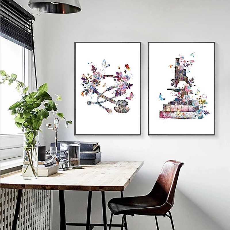 Подарок врачу медицинское устройство Акварельная художественная картина Печать на холсте стетоскоп кадуцеус микроскоп постер клиника настенное художественное украшение