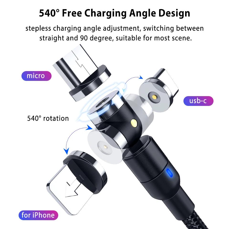 Магнитный кабель Micro USB Type-C, вращающийся на 540 , зарядный кабель для Samsung S20, S10, Note 10 Plus, Xiaomi Mi 10 Pro, магнитный кабель, 1 м2 м