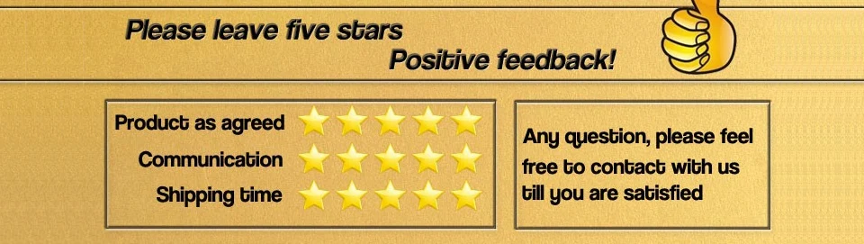 Пожалуйста, оставьте пять звезд положительные отзывы, если у вас есть какие-либо вопросы, пожалуйста, не стесняйтесь связаться с нами, пока вы не удовлетворены. Большое спасибо!