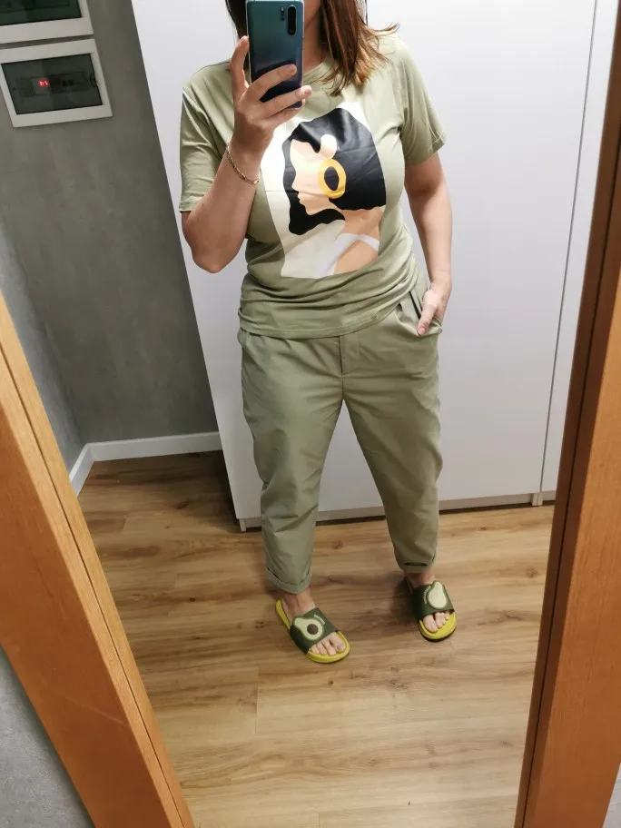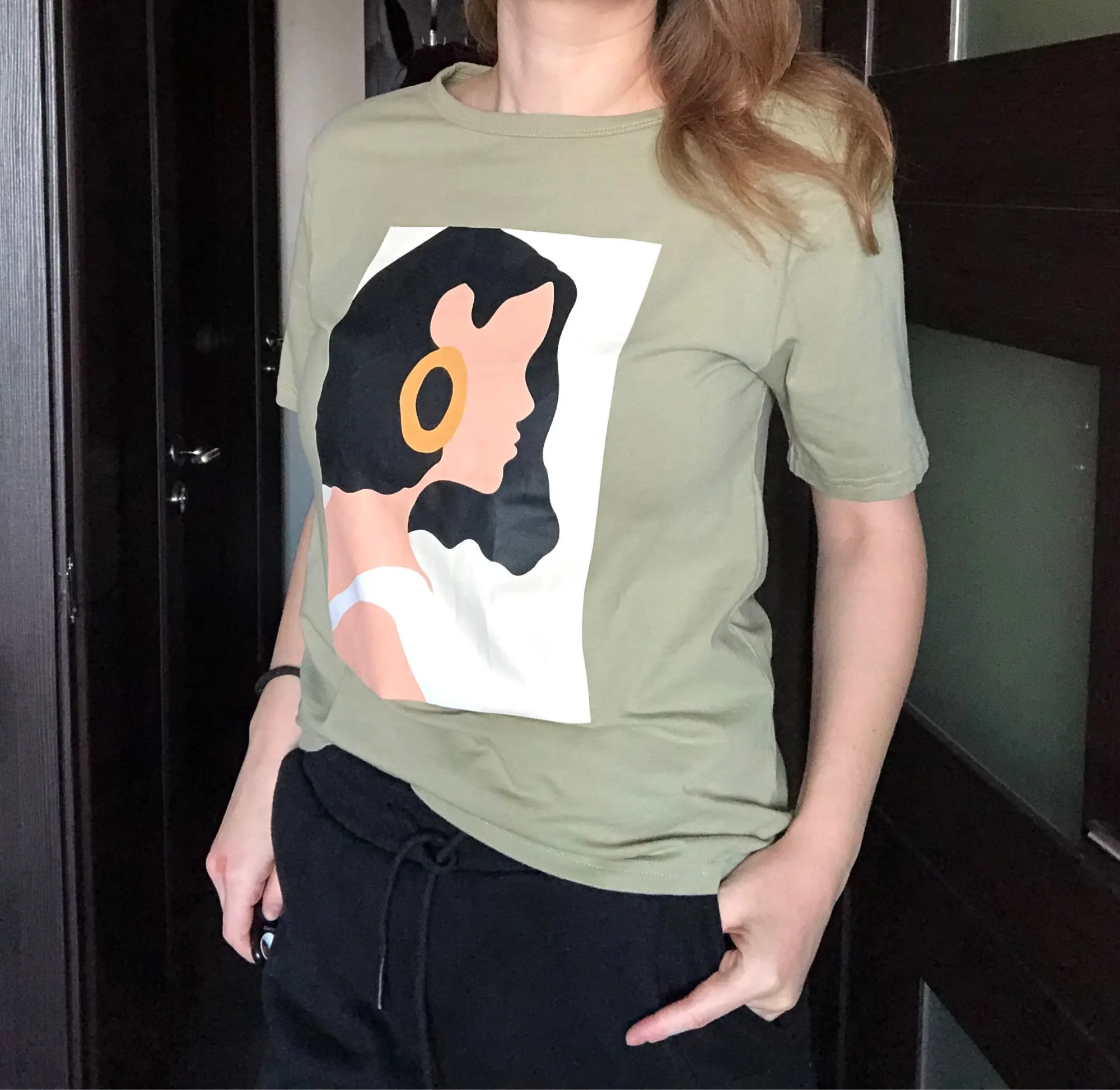 заказанноно цвета не было, и Я выбрала с другим рисунком, очень уж хотелось в оливковом цвете. футболка очень понравилась, качество отличное. 95%хлопок, 5% эластан. на мне сидит не свободно, что впринципе ожидаемо при параметрах: 88/72/95. но и не жмет негде. прилетела за полторы недели! рекомендую!