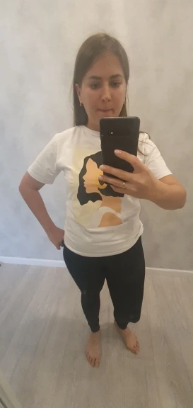 Футболка очень красивая,отличного качества. Мой рост 172, вес 53. Единственное,я бы чуть подлиннее хотела бы.