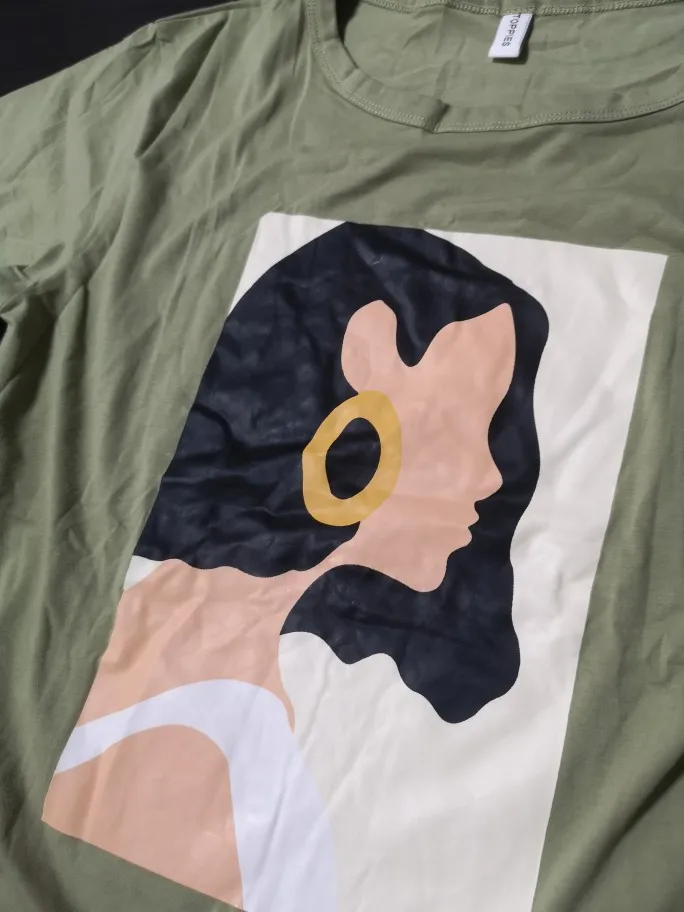 Футболка отличного качества, размер хороший, я ношу 42-44 села отлично , свободная. Нитки нигде не торчат, сшита аккуратно, запаха нет.