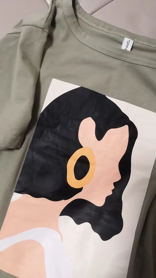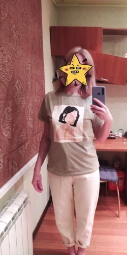 Футболка хорошая, наклейка не мягкая, летом думаю будет жарко . Я ее взяла не на лето, под кожаные штаны такого же цвета. Футболка на первый взгляд хорошая! На рост 176 она не длинная! Я брала для одежды с высокой талией . Цвет в жизни немного длиннее