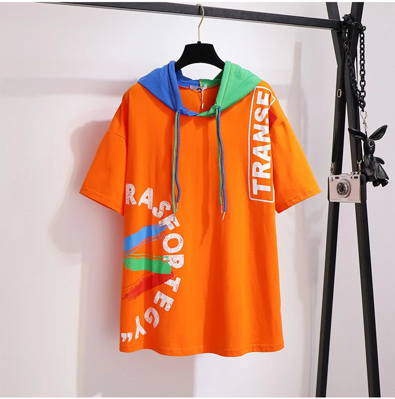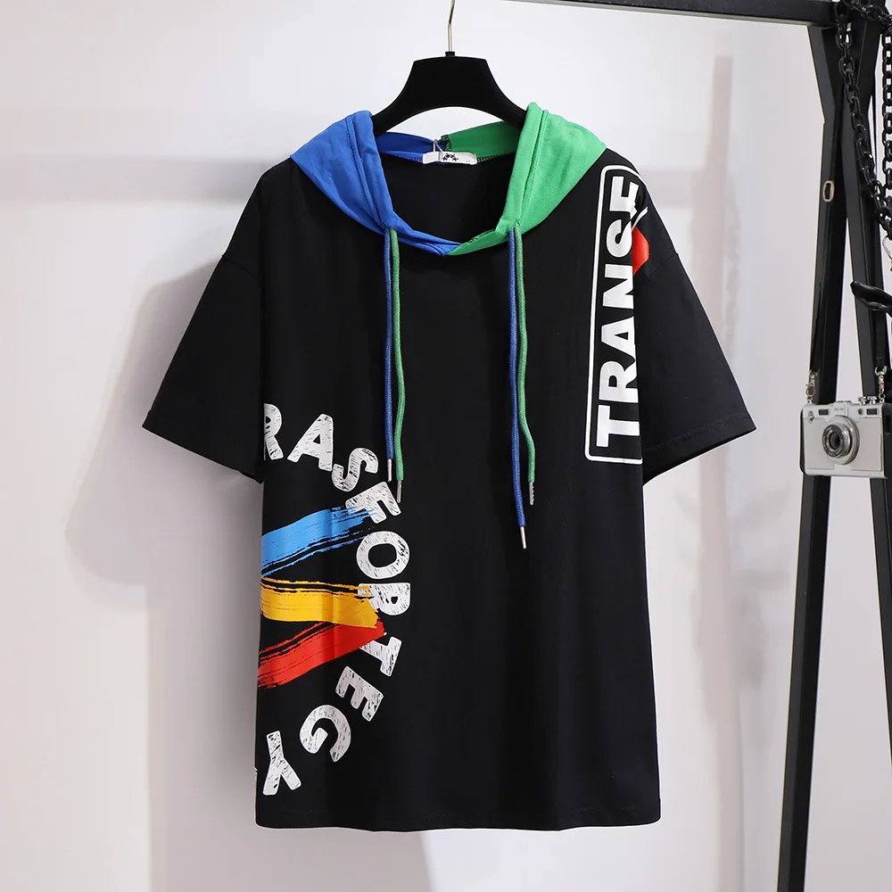 Женская летняя футболка с капюшоном и коротким рукавом, 150 кг
