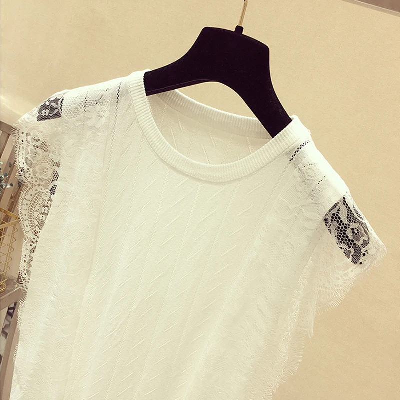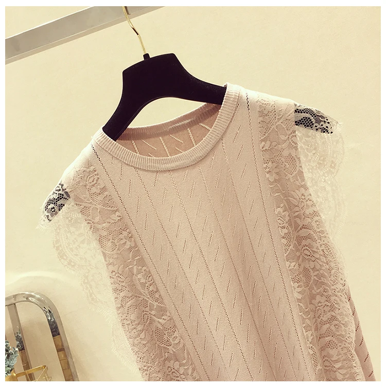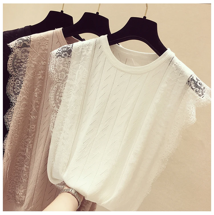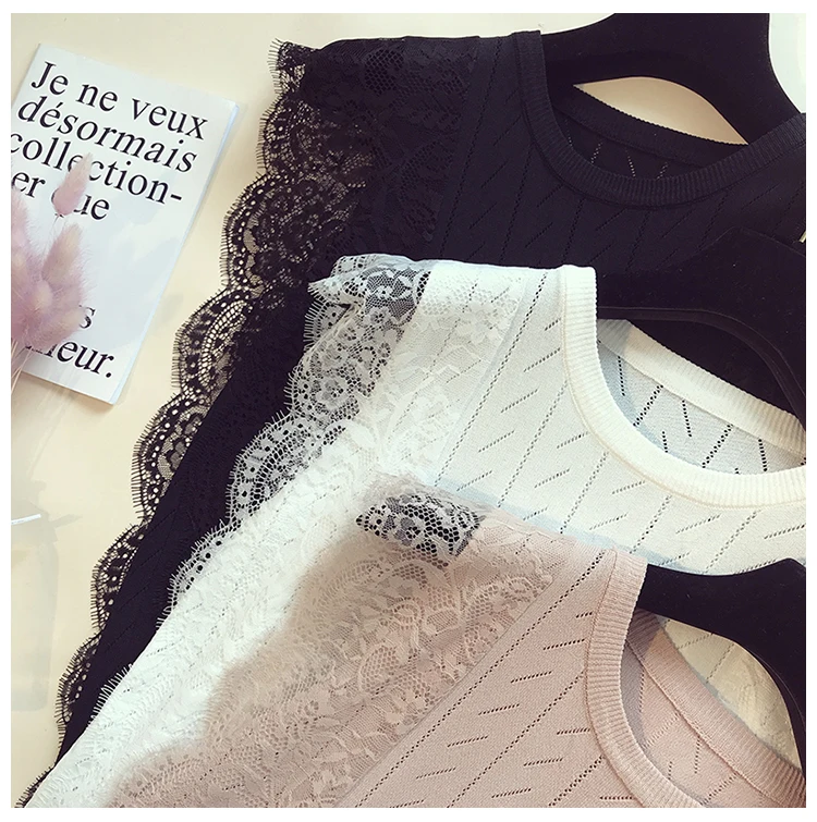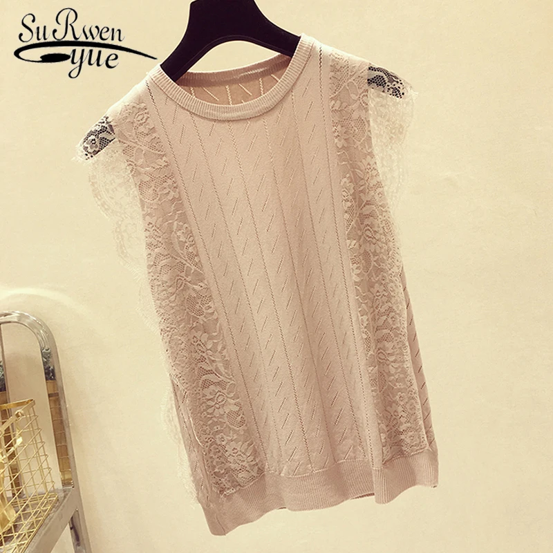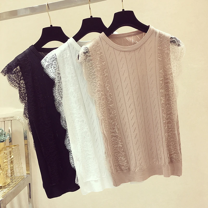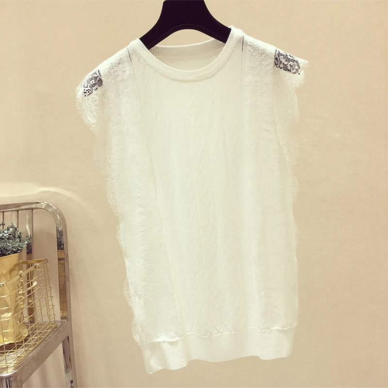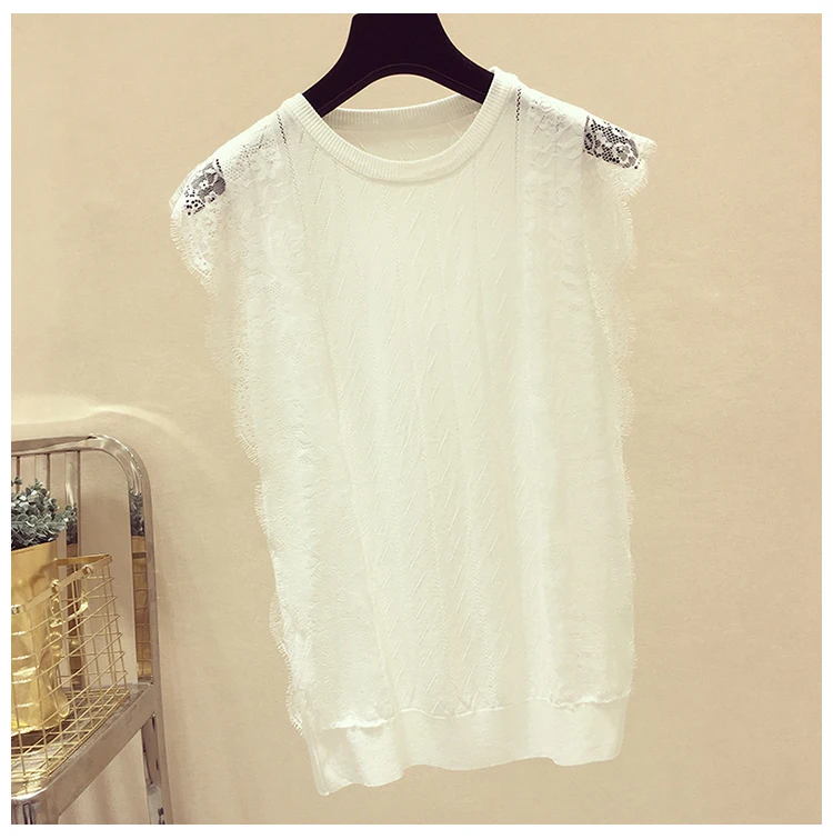 Женская кружевная блузка без рукавов, однотонная трикотажная сетчатая блузка составного кроя с круглым вырезом, модель 2021 50 в Корейском стиле на лето, 8795
