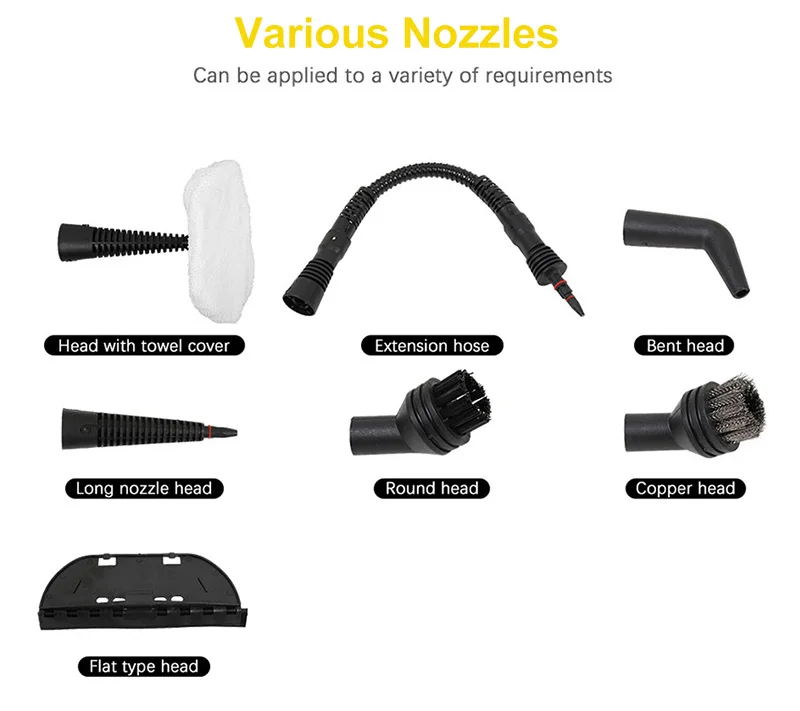 -Простой в использовании, легкий и портативный с 3 м шнуром питания для легкой мобильности -Пар высокой температуры и высокого давления для удаления пола, дверей и окон, одежды, грязи и пятен -Оснащена разными насадками для составления разных функций очистки -Стерилизация, экологичность и эффективность. Выбрасываемый после нагрева пар может достигать высокой температуры 130 град. С -Очищение воздуха. Формальдегид в помещении может быть эффективно удален методом увлажнения воздуха в помещении -Увлажнение воздуха. Естественное выделение пара в воздухе, регулировка влажности воздуха