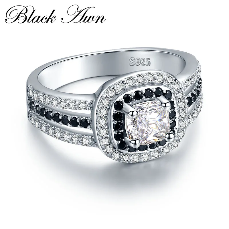 Женское Обручальное кольцо BLACK AWN, обручальное кольцо из стерлингового серебра 925 пробы с черным и белым камнем, модель C407
