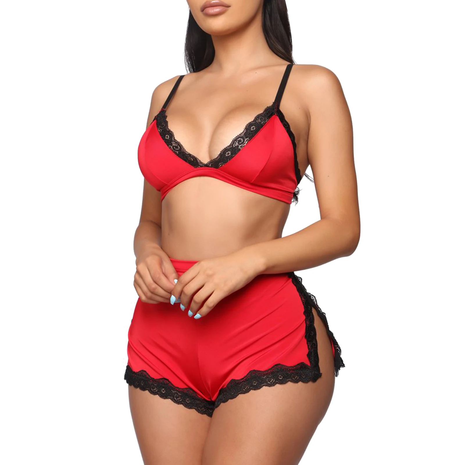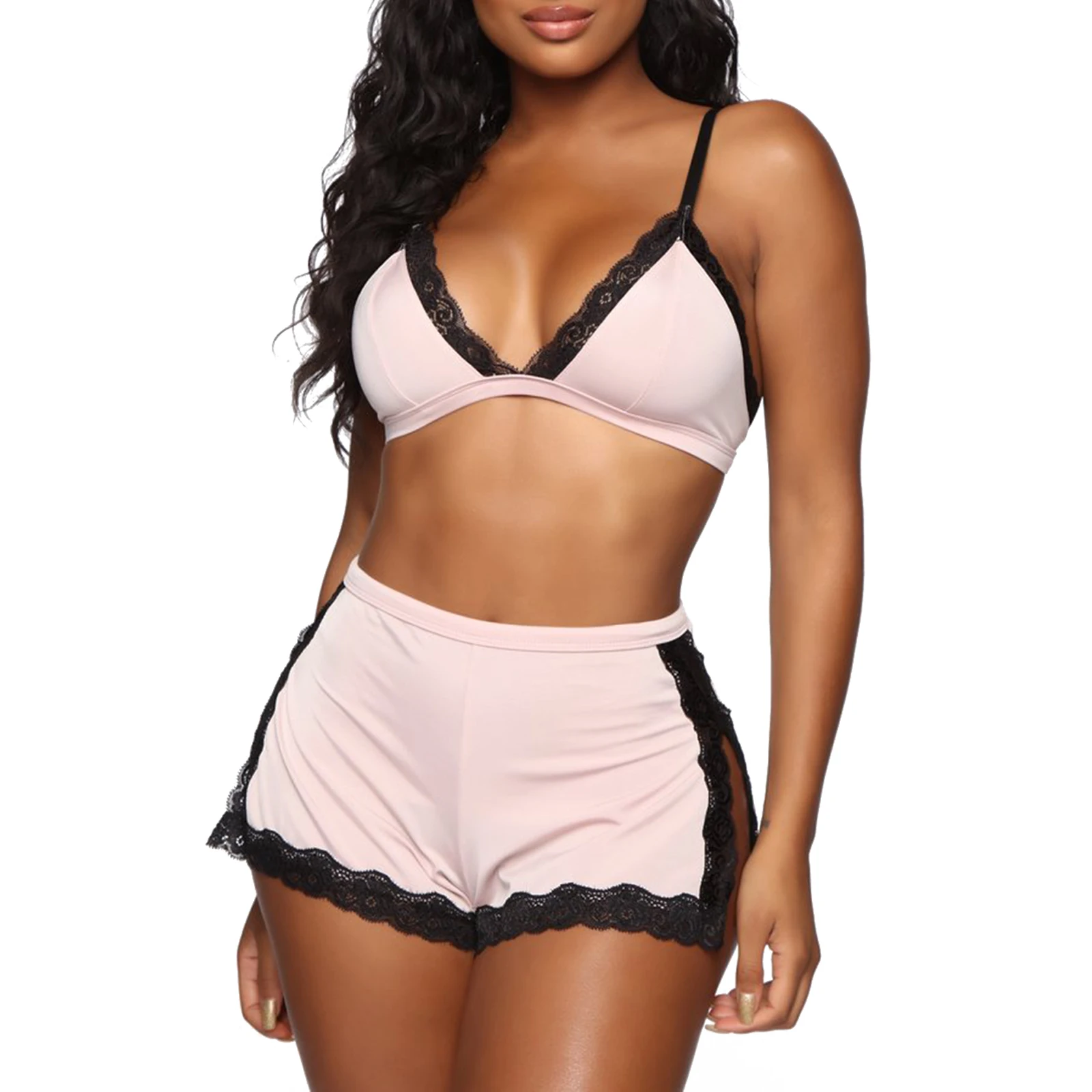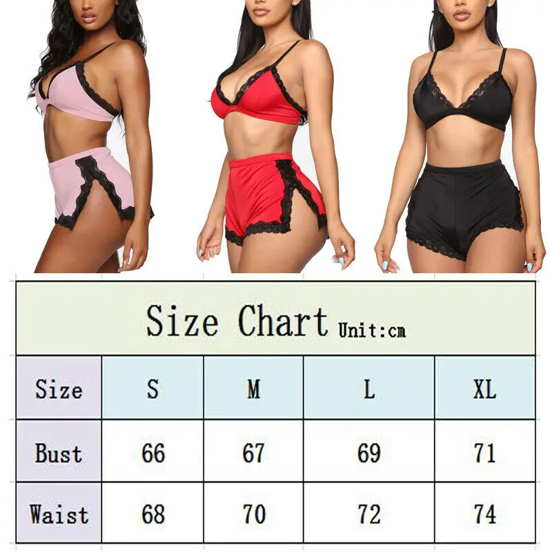 Пижамный комплект женский кружевной из 2 предметов, топ с V-образным вырезом, бюстгальтер и шорты с разрезом и высокой талией, одежда для сна, нижнее белье, лето