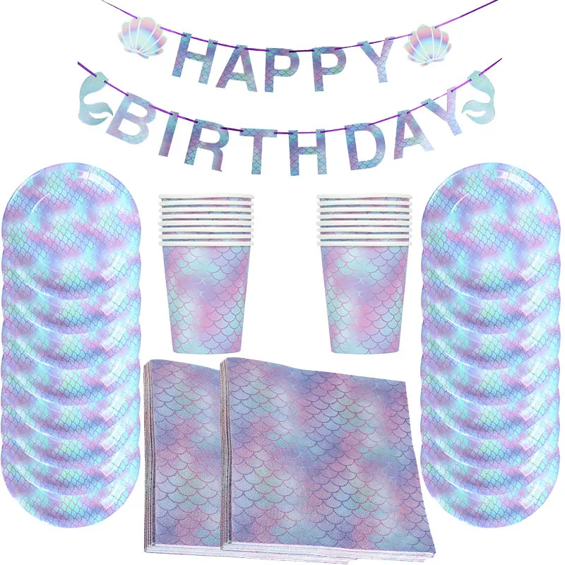 Детали: Тема: Русалка/под морем Материал: пищевая бумага Размер/Количество: 53 шт./лот = 16 шт. чашка + 16 шт. пластина + 20 шт. салфетка + 1 набор баннеров Цвет: как на картинке Количество: 53 шт