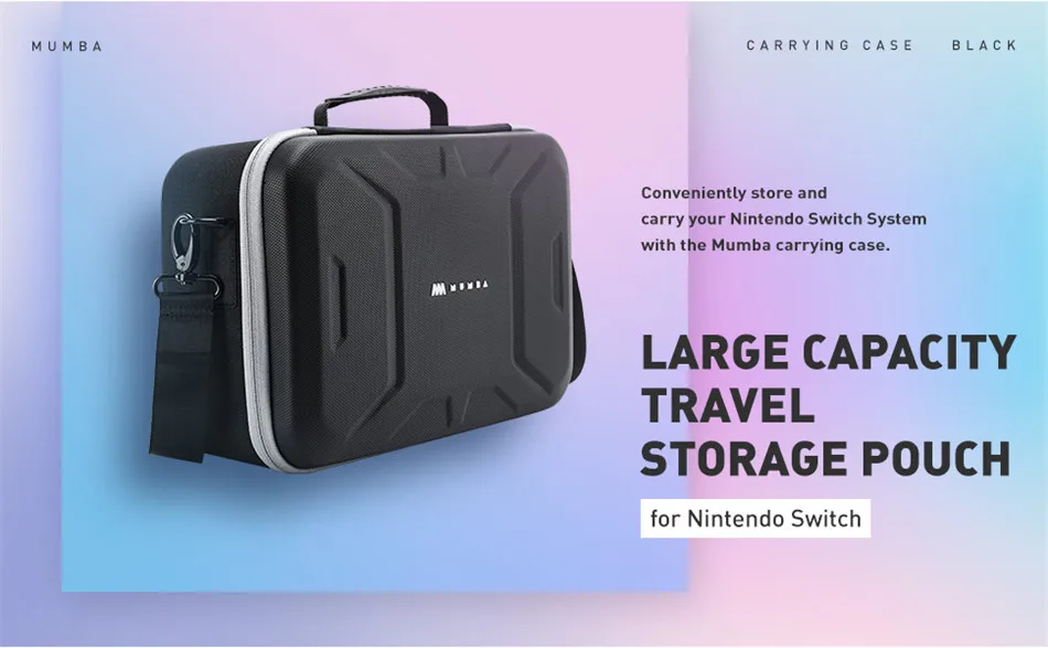 Чехол для путешествий Mumba Deluxe, Прочный чехол для Nintendo SwitchНаслаждайтесь максимальной защитой для вашей игровой системы Nintendo Switch, используя Роскошный Жесткий чехол для путешествий от Mumba! Обладая большим пространством для вашей консоли, док-станции, профессионального контроллера и многого другого, вам понравится надежная защита на 360 ° от ударов, царапин, капель и даже воды! Сделано со встроенным держателем для игры до 27 ваших любимых названий, это самое лучшее решение для фанатов Nintendo везде!
