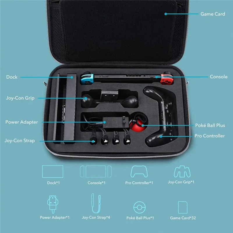 [Большая емкость] Портативный и удобный в переноске чехол обеспечивает хранение для полной системы Nintendo Switch: poke ball, switch console, dock, AC adapter, grip joy-con даже с дополнительными лямками joy-con, joy-con и кабелем HDMI и дополнительным переключателем Pro и удерживающим 27 игровых карт.[Жесткая защита] Легкий, но прочный внешний жесткий чехол EVA отличается высокой водонепроницаемостью и обеспечивает превосходную защиту от капель, пыли и разливов. Гладкая Скользящая молния позволяет быстро и легко получить доступ к вашему переключателю.[Индивидуальный интерьер] Отделите отсеки из вспененного этилвинилацетата, чтобы обеспечить безопасное место и безопасность от ударов и царапин[Дополнительное хранилище] сетчатый карман на молнии достаточно велик, чтобы хранить кабели HDMI и другие аксессуары, сохраняя их в безопасности и порядке.[Подходит для путешествий] поставляется с нескользящей прорезиненной ручкой для переноски и регулируемым плечевым ремнем для удобной переноски всех ваших переключателей и аксессуаров, куда бы вы ни отправились.