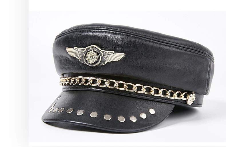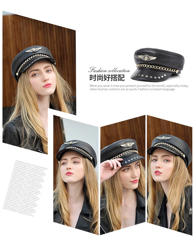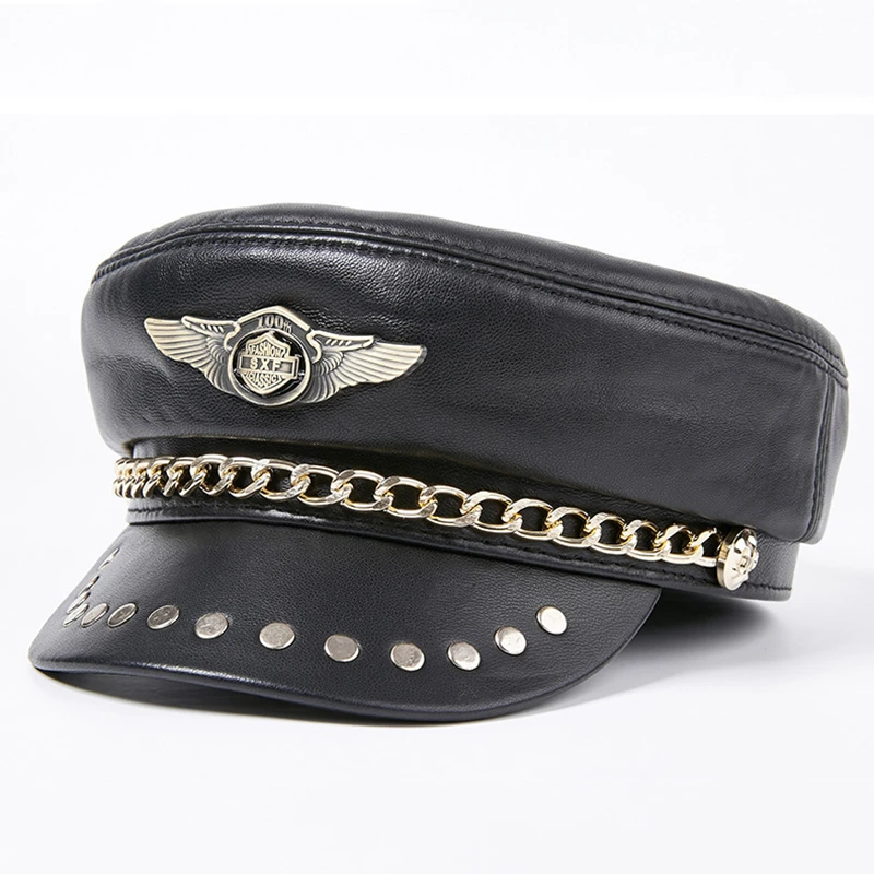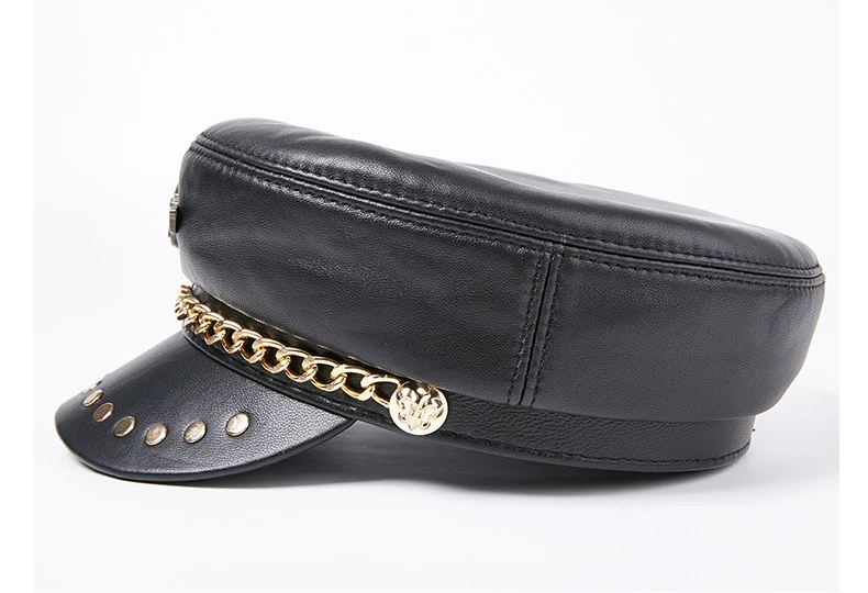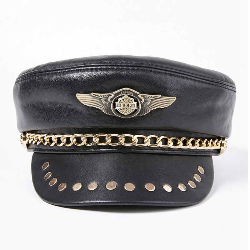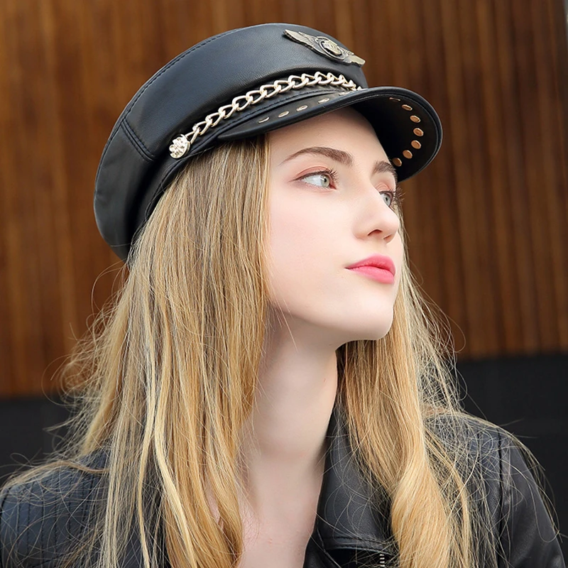 Женские военные Кепки из натуральной кожи, черные мотоциклетные армейские кепки в стиле рок с цепочкой, женские осенние Кепки из натуральной кожи на плоской подошве