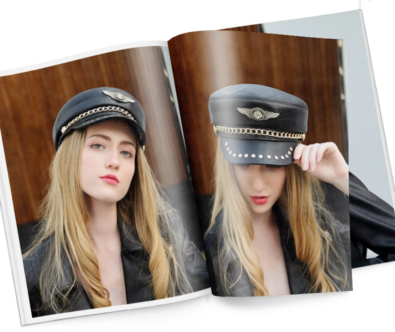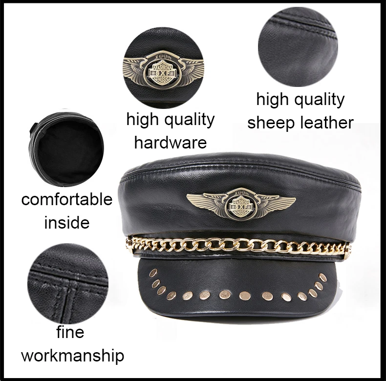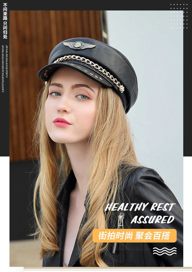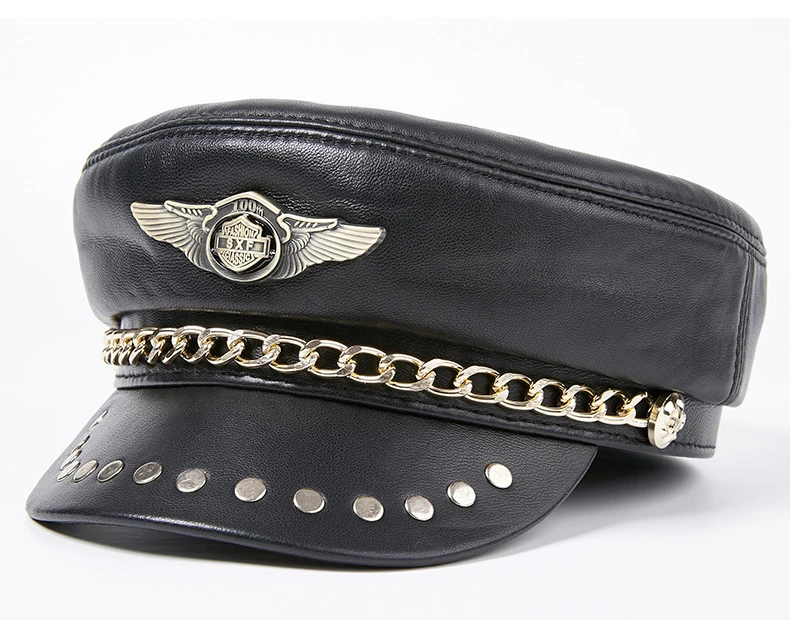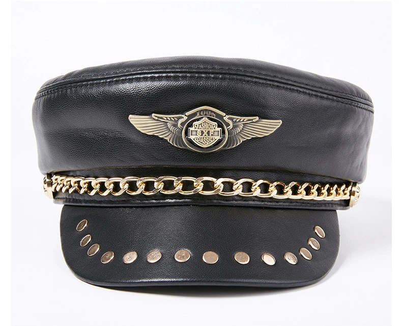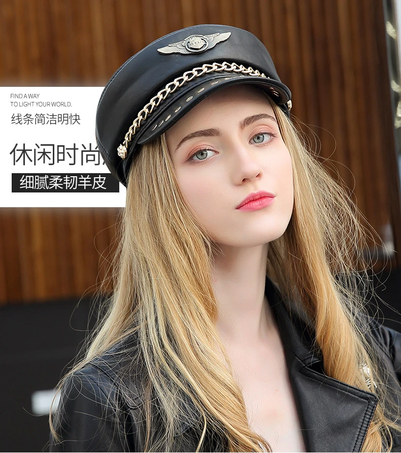 Женские военные Кепки из натуральной кожи, черные мотоциклетные армейские кепки в стиле рок с цепочкой, женские осенние Кепки из натуральной кожи на плоской подошве