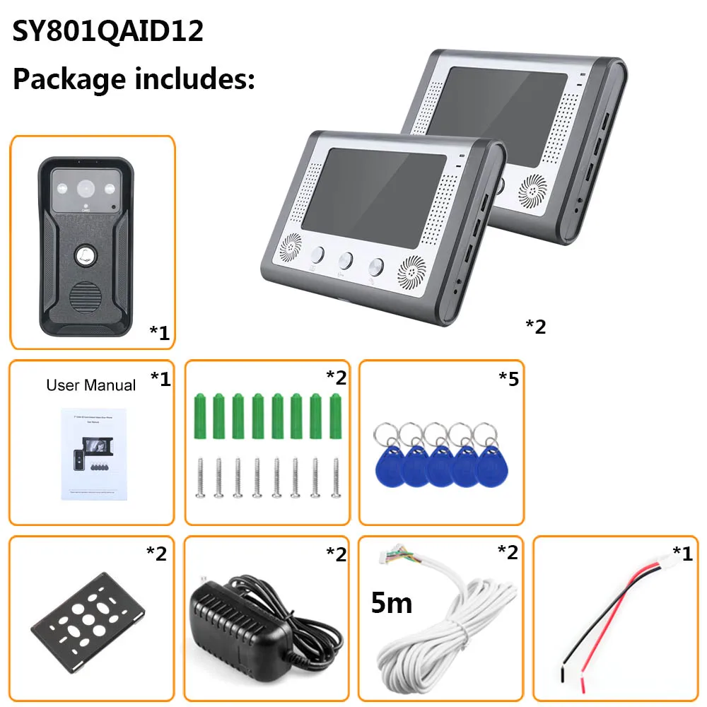 TFT ЖК-экран 2x7 дюймов 1x1000 ТВ-линия ID наружная камера 2x15 в 1,2 А Блок питания 5 x идентификационных карт Монтажная пластина-2 шт. Кабель 2x5 м 1 х Винтовая сумка 1 x Руководство пользователя