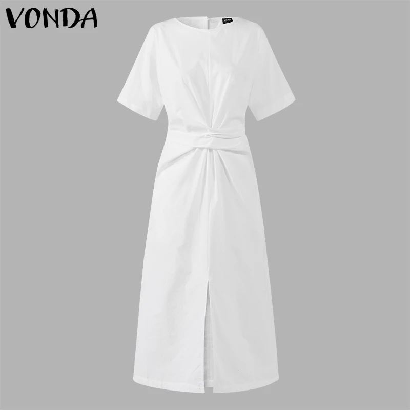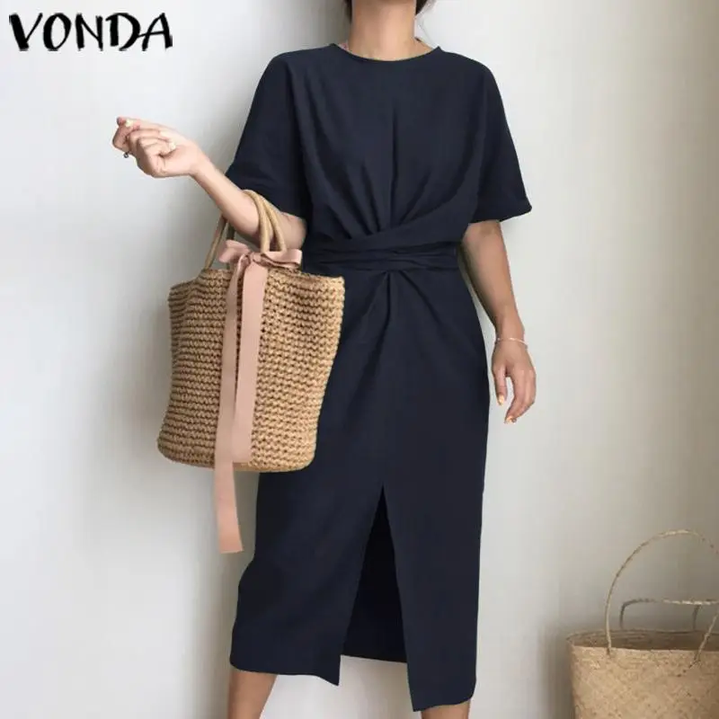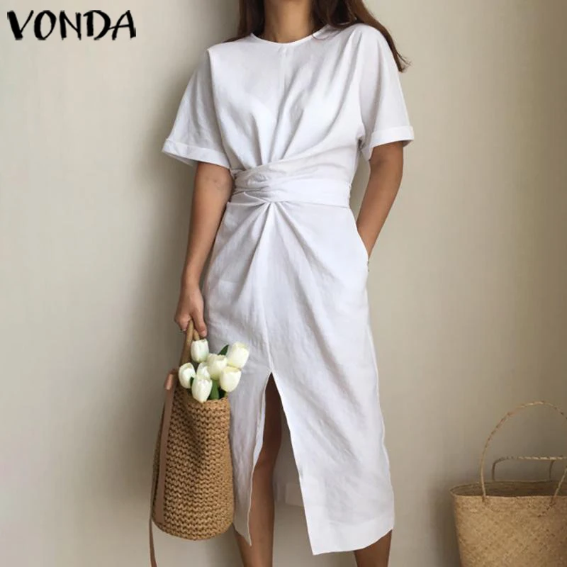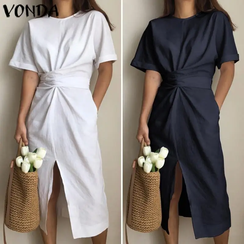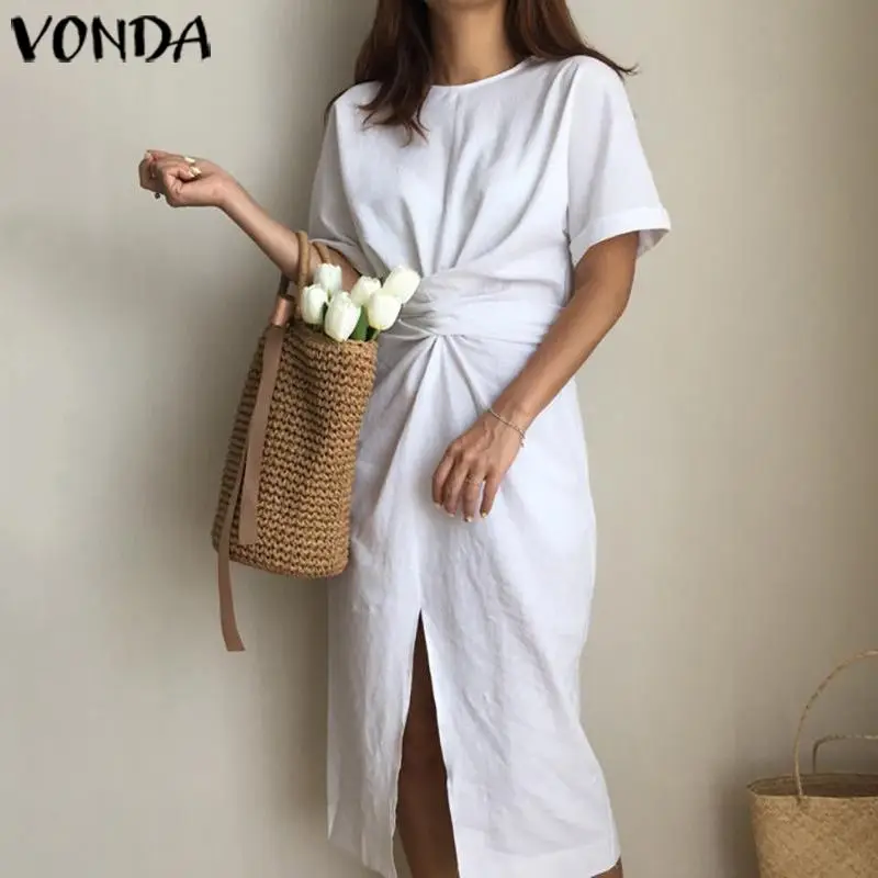 Платье VONDA женское повседневное с коротким рукавом, свободная Пляжная туника из чистого хлопка с разрезом спереди и бантом, праздничный сарафан, 2021