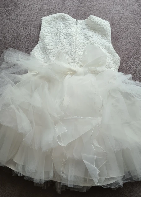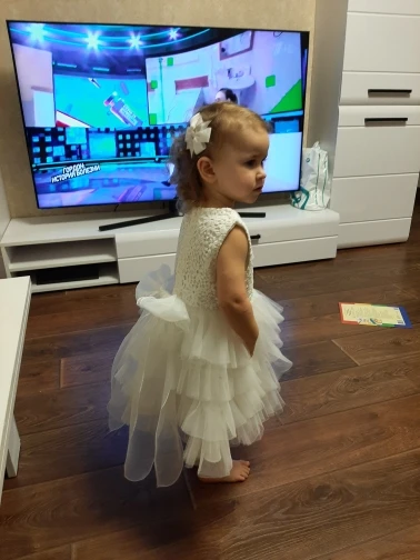 Платье симпатичное, только юбка не настолько пушистая как на фото. Жаль, ошиблась с размером, на один точно велико. Ребенок 1г. 11 мес. Рост 88, вес 12,5 кг. На платье размер 100 (заказывала 2Т). но и меньшего размера у продавца не было.