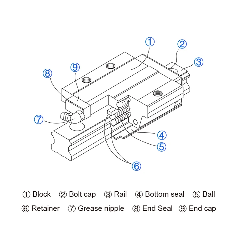 Система циркуляции прокатки: блок, рельс, Торцевая крышка и фиксатор.