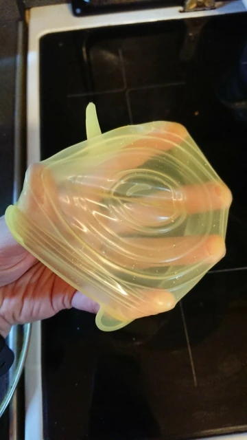 Отличный набор крышек. по моему мнению тонкая резина, поэтому надо тщательно подбирать посуду, чтобы не порвать крышку от натяжения. удобные язычки для натягивания крышки. забавный смайлик нарисован в середине изделия.