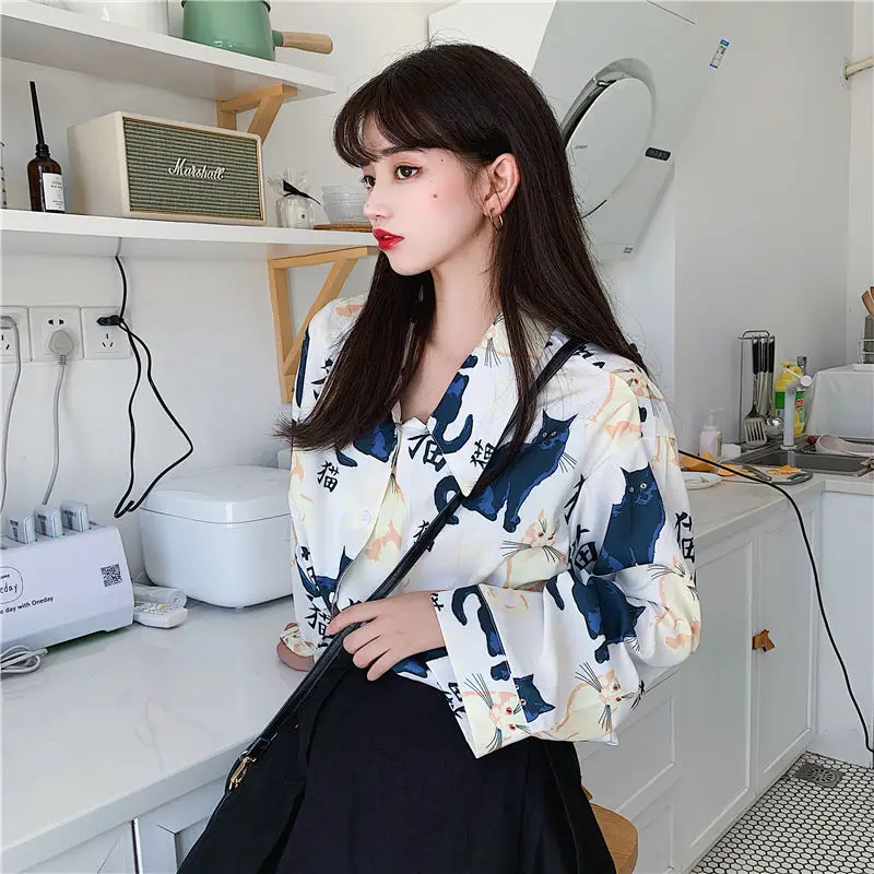 Женские летние блузки в стиле Харадзюку, винтажные рубашки с принтом в виде кота