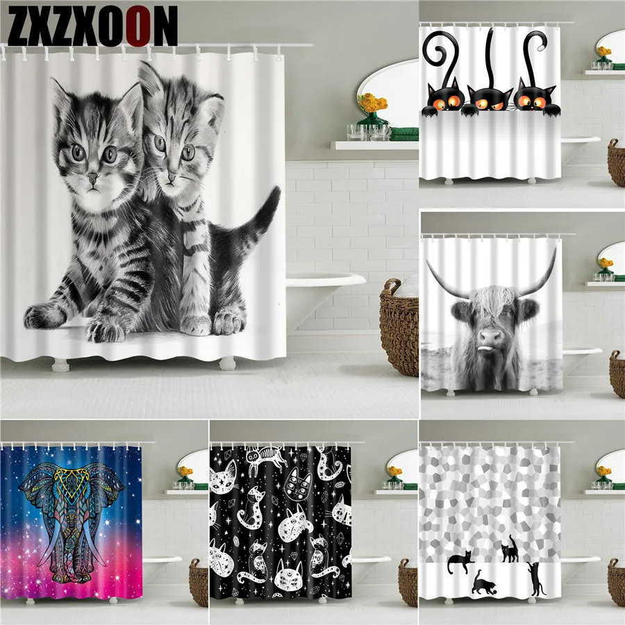 Платье с принтом кошечек мультфильмов душевая занавеска Водонепроницаемая занавеска для ванной полиэстер ванная комната дети шторы с крючки животных черный, белый цвет домашний декор