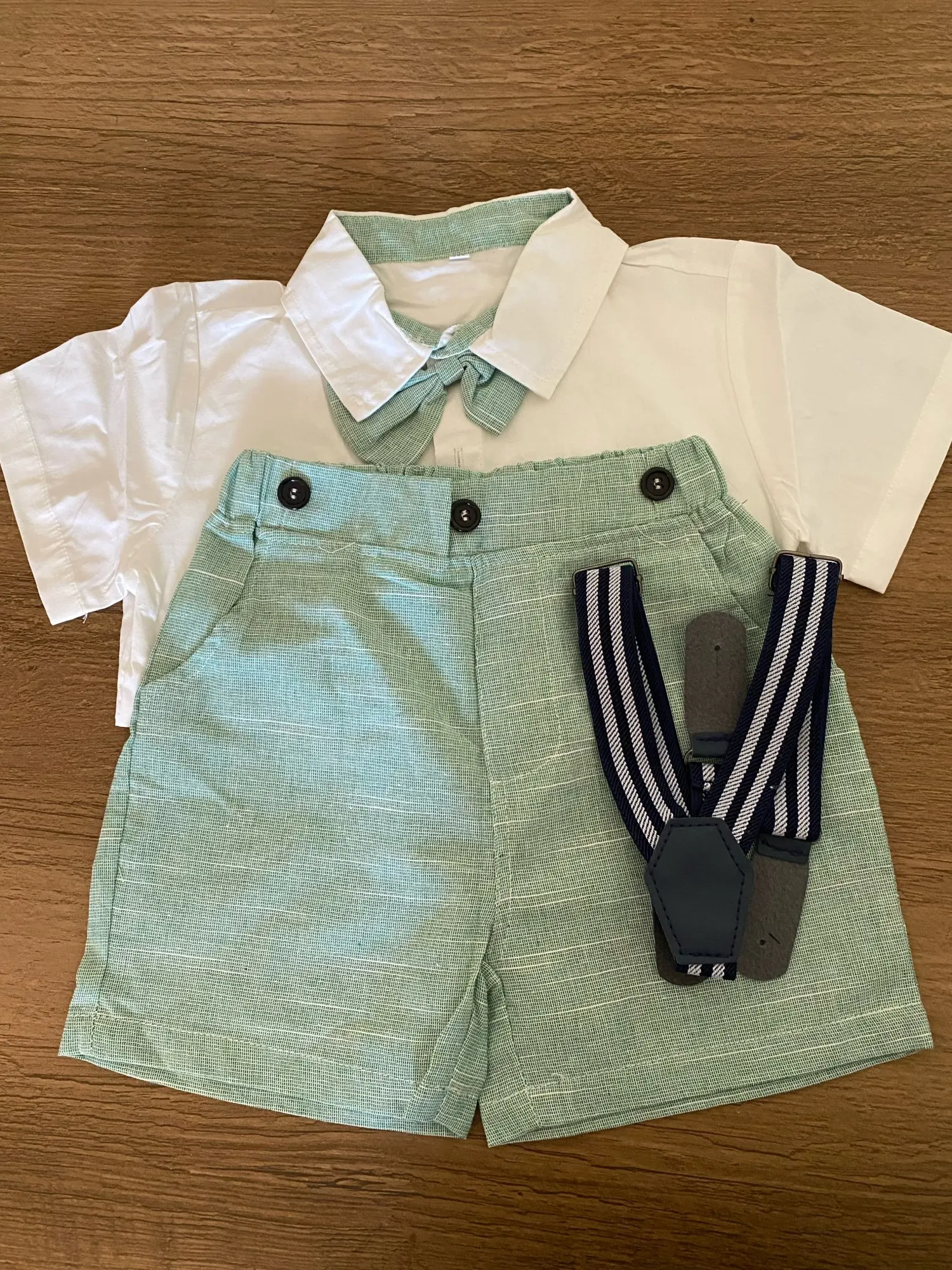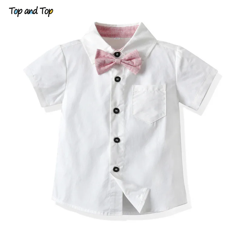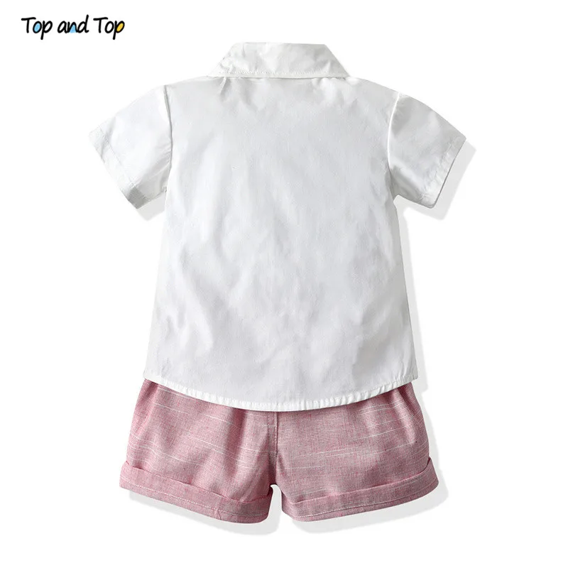 Топ и топ, летний детский официальный костюм для маленьких мальчиков, рубашка с коротким рукавом + брюки на бретелях, повседневная одежда, наряд для джентльмена, комплект из 2 предметов