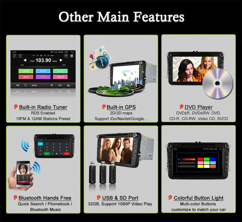Функция включена: FM/AM-радио + RDS + GPS + Bluetooth + мультимедиа (USB)+ вход AUX + зеркальное отображение экрана + Встроенный Wi-Fi+ДВД Поддержка нескольких устройств:4G SIMКарта, DAB +, DVR, TPMS, цифровое телевидение, OBDII, заднийКамера, внешний микрофон...