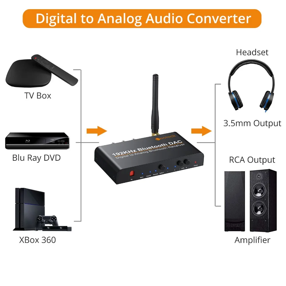 Цифровой коаксиальный преобразователь Toslink в аналоговый стерео 192 кГц, аудиокабель, совместимый с Bluetooth, RCA, 3,5 мм, Поддержка AptX, низкая задержка
