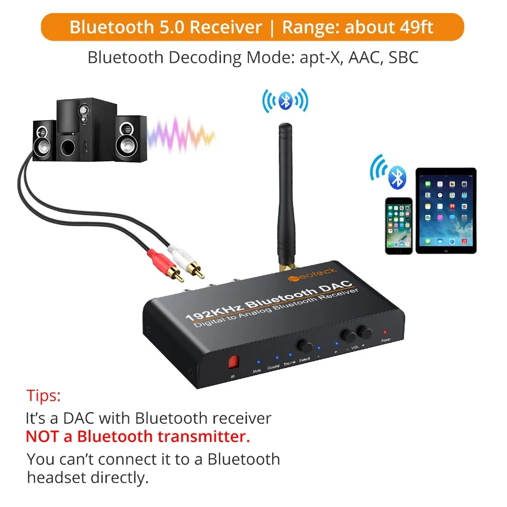 Цифро-аналоговый аудиопреобразователь Преобразует коаксиальный или Toslink Цифровой аудиосигнал в аналоговый L/R аудио и доступен для подключения к внешнему устройству. Встроенный модуль Bluetooth-Compatiblereceiver, поддержка мобильного телефона Bluetooth-Compatibleaudio push, Bluetooth-Compatible5.0 технология передачи без потерь.