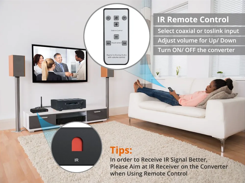 5. С ИК беспроводным пультом дистанционного управления, легко регулировать громкость/выбрать коаксиальный или toslink вход/отключение звука/включение питания или выключение с помощью ИК беспроводного пульта дистанционного управления. Для получения сигнала лучше, пожалуйста, убедитесь, что пульт находится перед инфракрасным ИК-индикатором на конвертере.