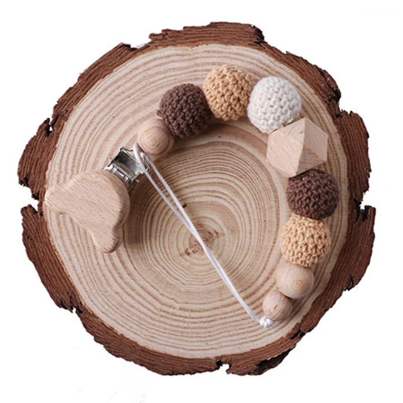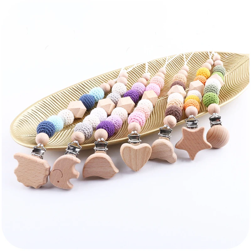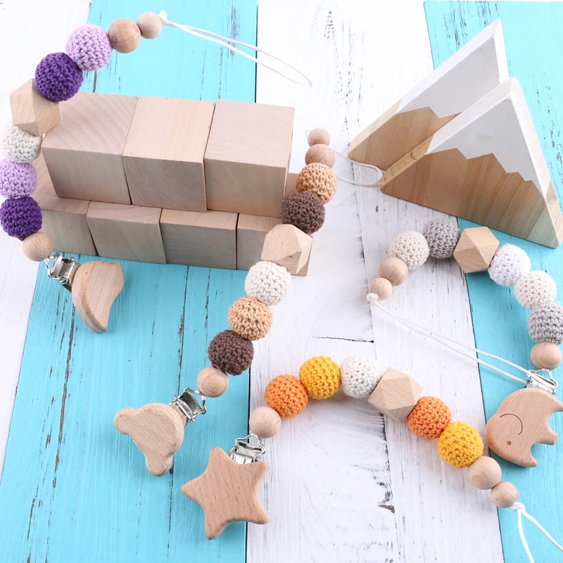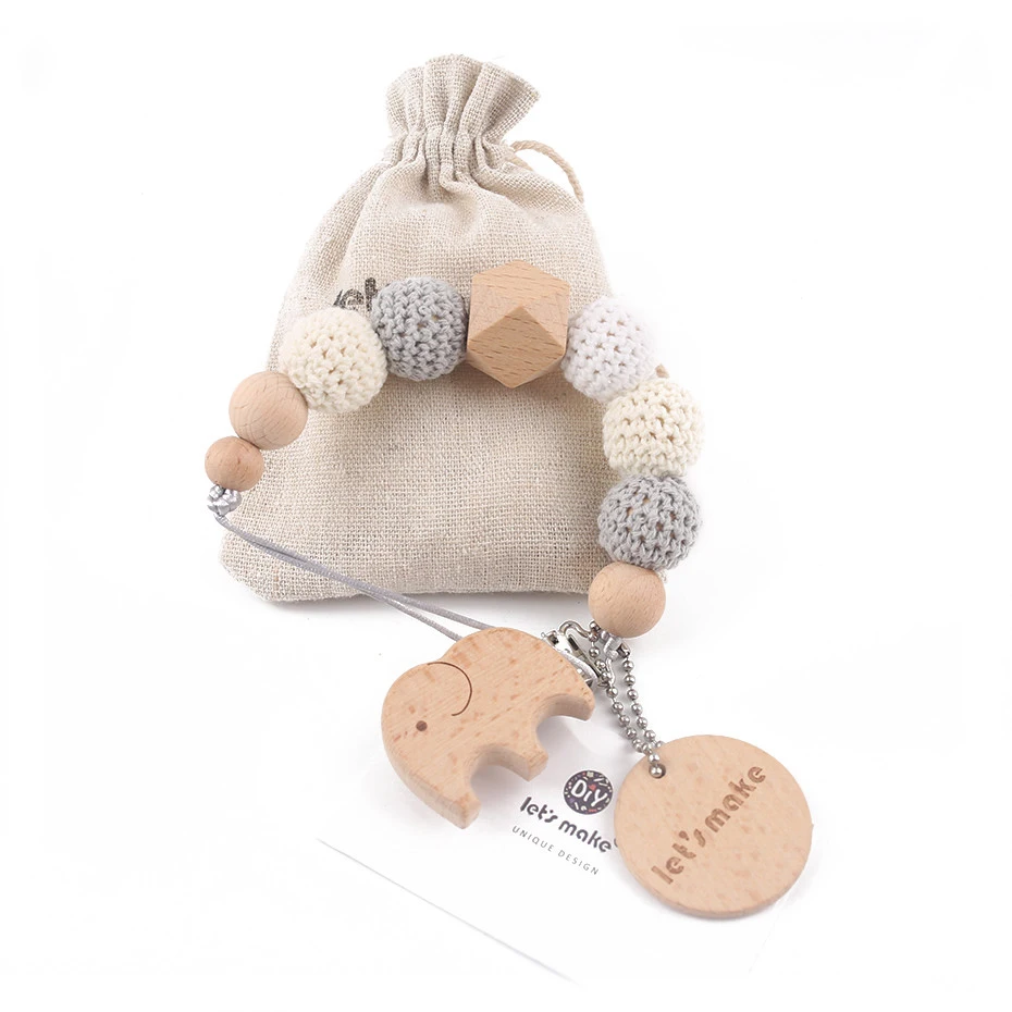 1 шт., вязаная крючком цепочка для детской соски, Слон из бука, деревянный зажим, геометрические бусины, сумка, деревянный прорезыватель, крошечная удочка, фиксаторы для детей