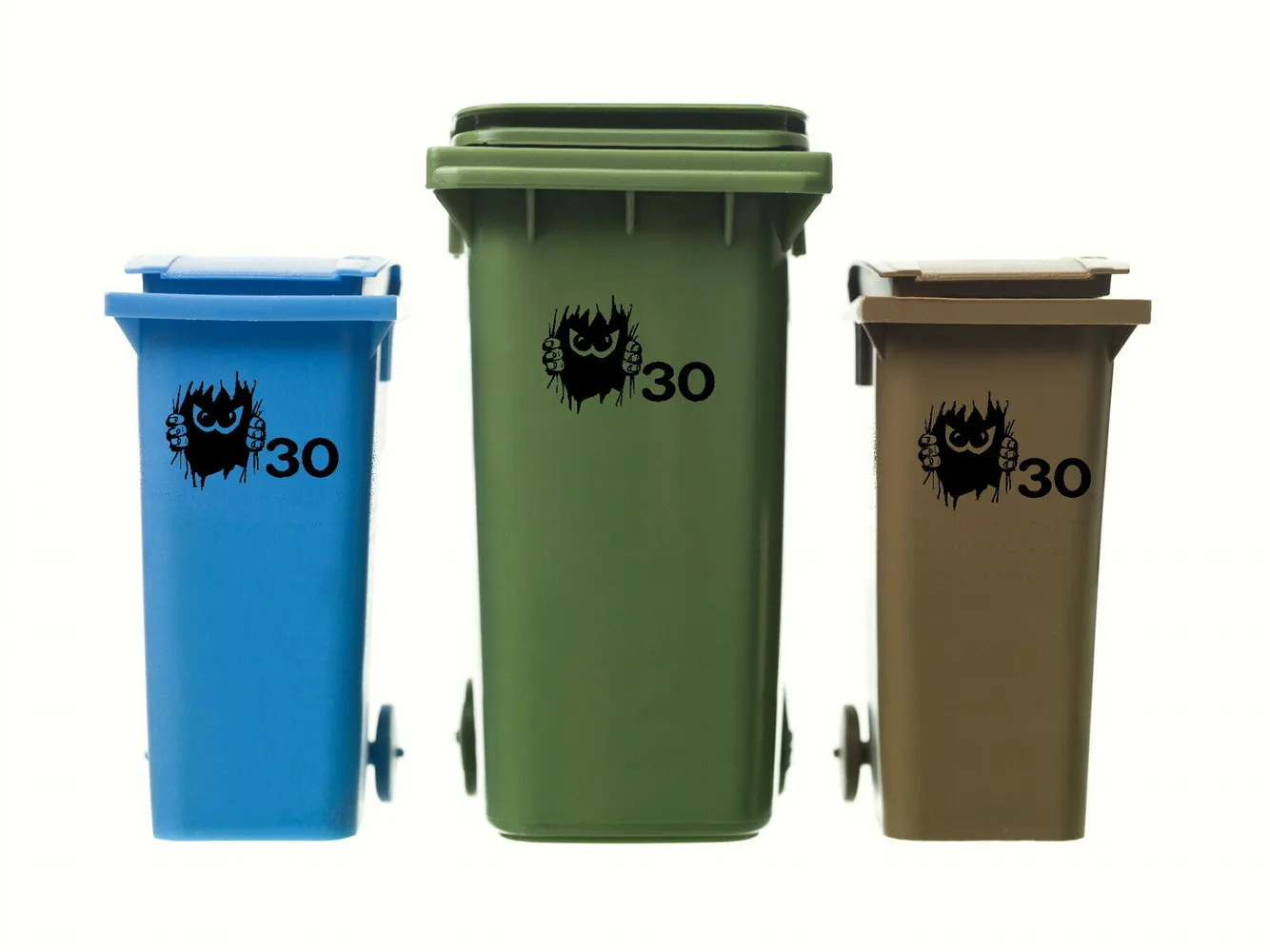 Наклейки на ведро с колесами X 3 ** глаза и номер дома ** черный, белый