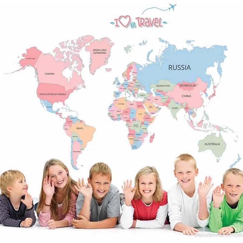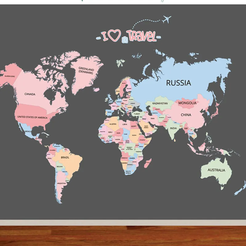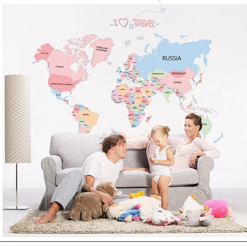 Красочные настенные наклейки, Карта путешествий мира, декоративные наклейки, настенные наклейки для детской комнаты, развивающая детская карта, классная буква для малышей