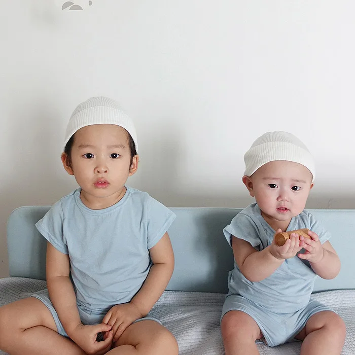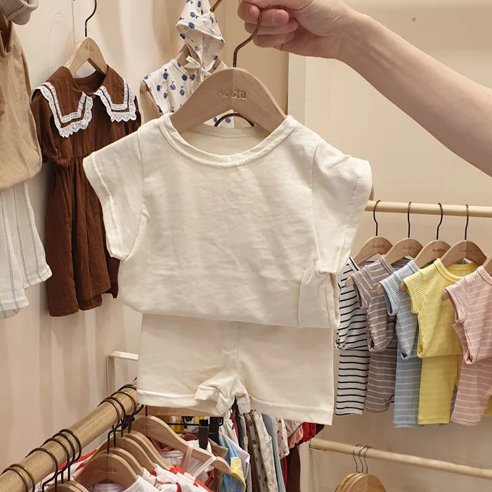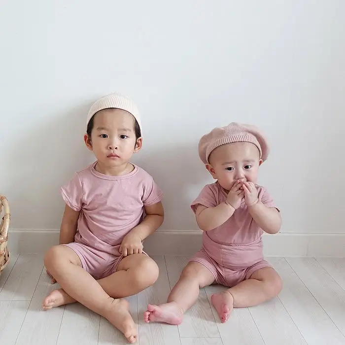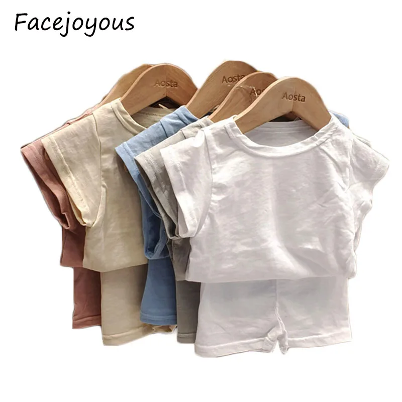 2020 летний хлопковый комплект одежды для малышей, Однотонная футболка для девочек и мальчиков, футболка с короткими рукавами и шорты, комплект одежды из 2 предметов для маленьких девочек