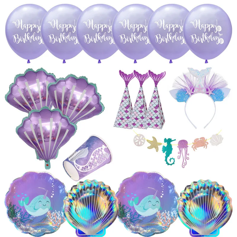 Маленькая Русалочка, фантастическая фиолетовая Русалочка, одноразовая посуда для дня рождения, украшение, бумажная тарелка, чашки, воздушные шары, принадлежности