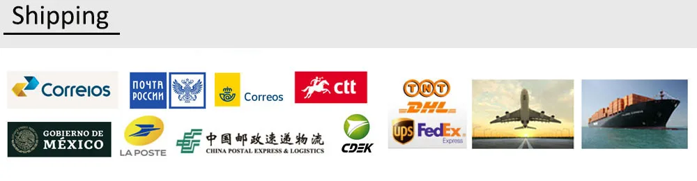 Международная почтовая посылка (15-35 дней доставки)DHL/Fedex/TNT/UPS (5-10 дней доставки)Авиаперелет (15-20 дней доставки в аэропорт)По морю (от 35 до 40 до порта)Вышеуказанное время доставки-это расчетное время в соответствии с нашим опытом. Существует много неконтролируемых факторов, которые вызывают задержку во время транспортировки. Надеемся на ваше понимание.