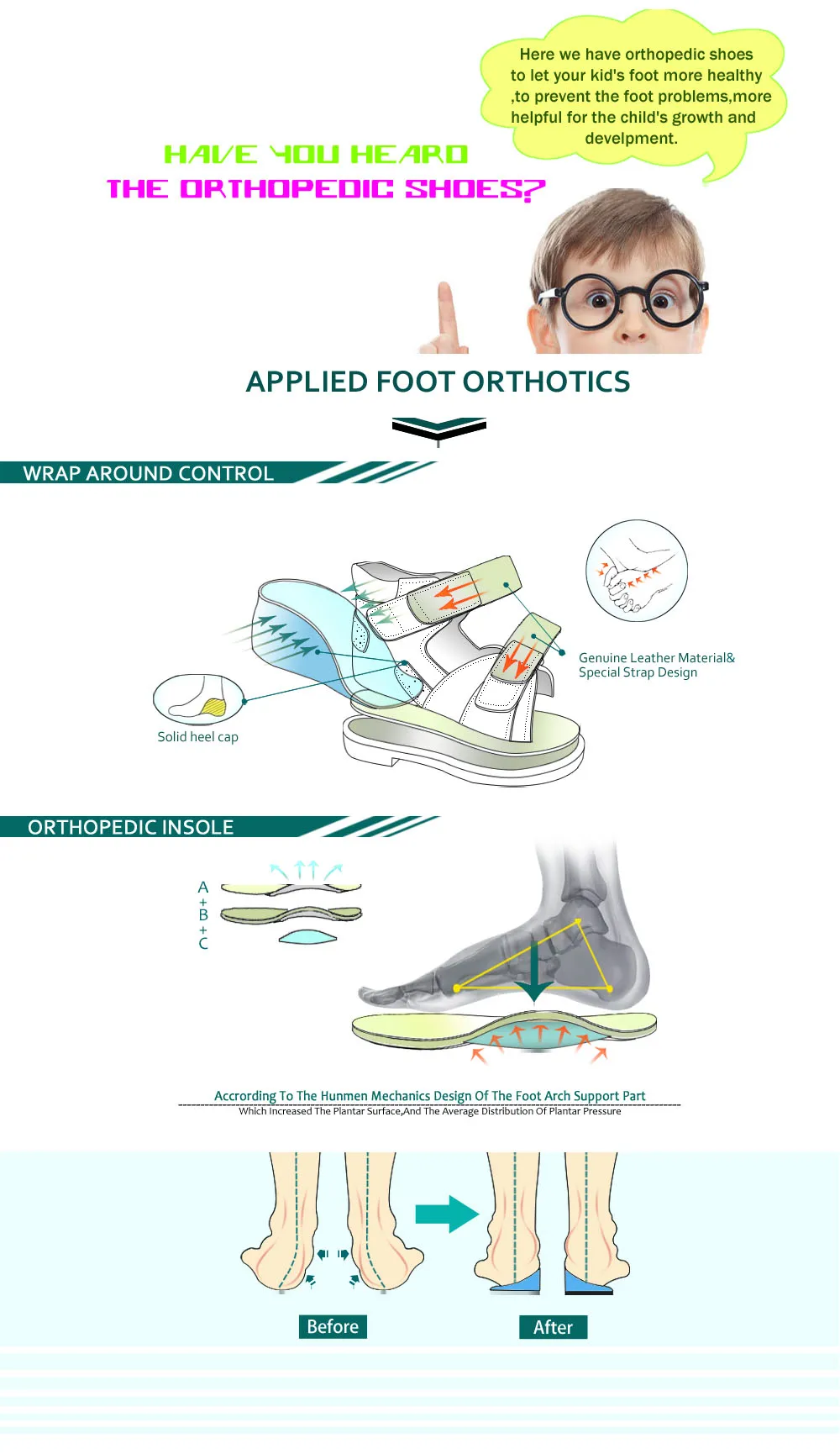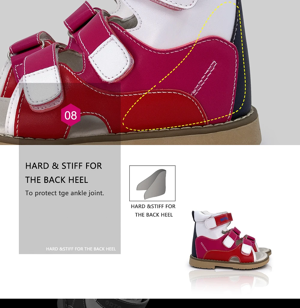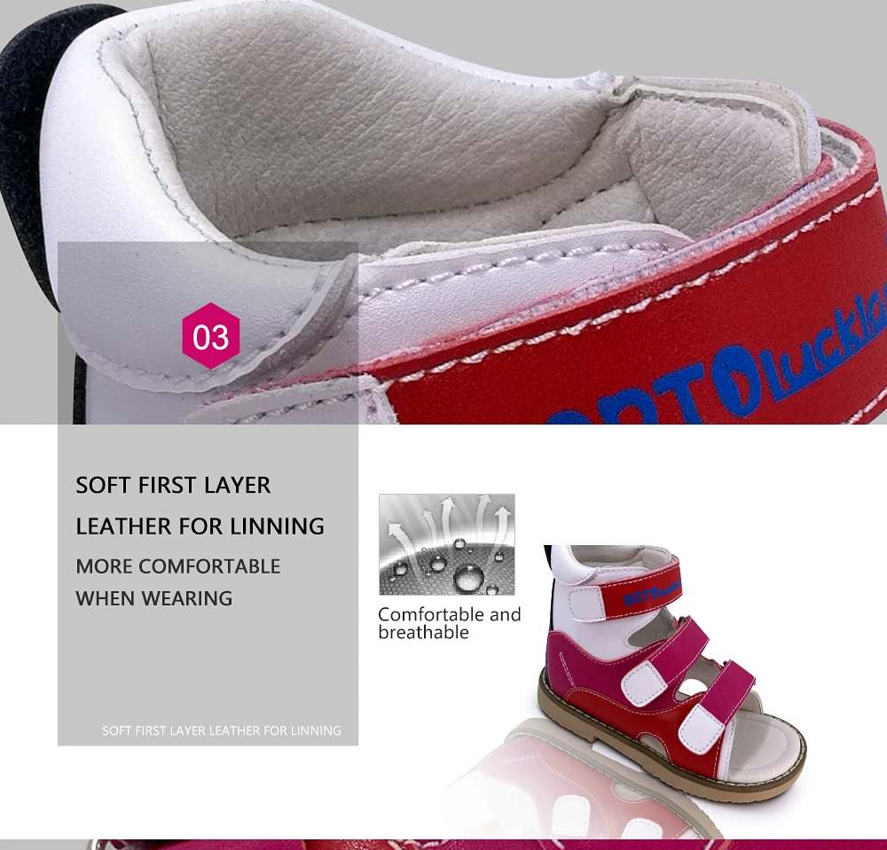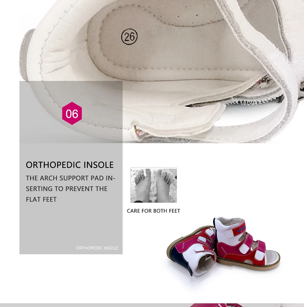 > 1. Каковы ортопедические туфли?Ортопедическая обувь-это медицинская обувь, призванная предотвратить и исправить патологию ног, может защитить стопу сустава и исправить деформацию ног, чтобы помочь здоровому росту суставов детской ноги. > 2. Каковы особенности ортопедической обуви?1) прочные и прочные удлиненные задние колпачки стабилизируют стопу в правильном положении.2) мягкие внутренние воротники обеспечивают гладкий контакт кожи с краями обуви во время движения.3) Арка поддержки стельки и Томас пятки подошвы, чтобы дать поддержку стопы.4) застежка на липучке плотно фиксирует ноги внутри обуви > 3. Каковы функции ортопедической обуви?Для профилактики и лечения ортопедических аномалий. Для предотвращения и исправления детской плоскостопия, лапки, стопа с вальгусной деформацией, супинатором, пронатором, клубной стопой, ногой X/O и т. д. > 4.подходит ли для ортопедической обуви нормальная стопа?Да, нормальные здоровые ноги также подходят для ношения ортопедической обуви. Ортопедическая обувь очень важна для первых шагов ребенка, фиксирует стопу, увеличивает площадь опоры стопы и перераспределяет нагрузку на тело, избегая деформации стопы, чтобы помочь нормальному здоровому росту ног. Поэтому родитель должен начать выбирать ортопедическую обувь для ваших детей, когда ребенок учится ходить.