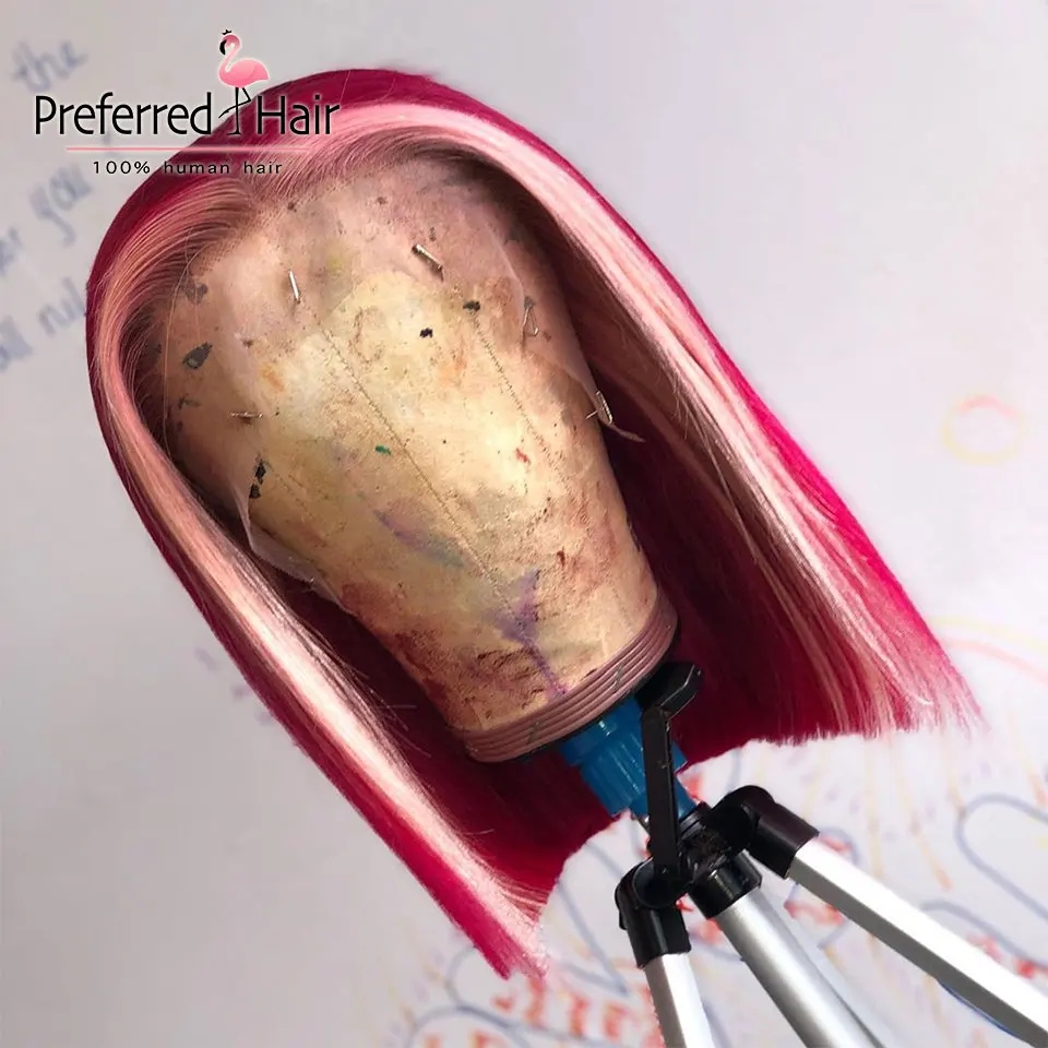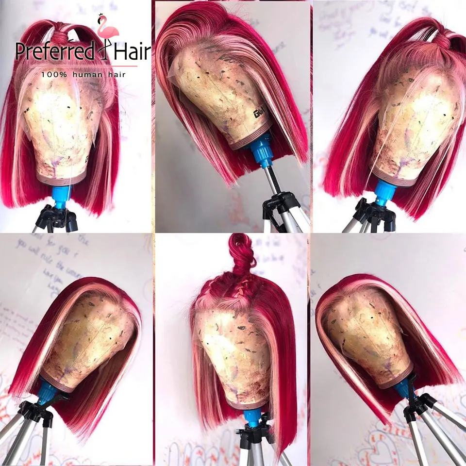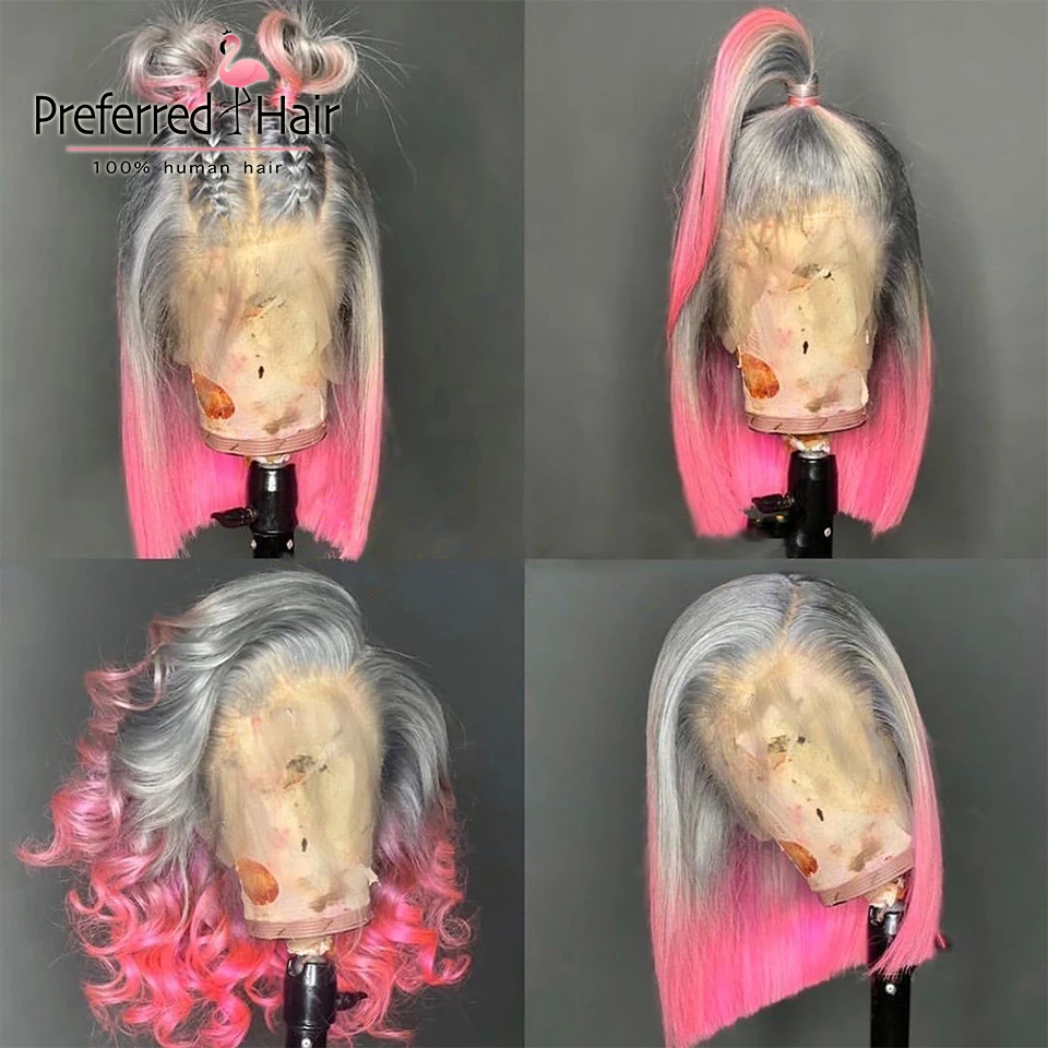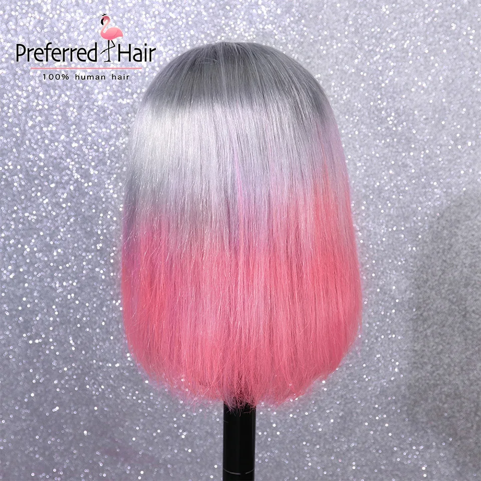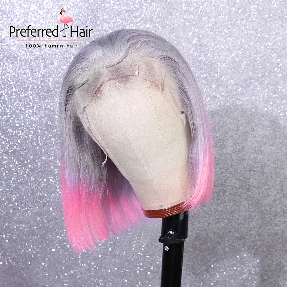 Предпочтительный Омбре синий боб парик предварительно сорвал 13x 6 парик фронта шнурка бразильский Remy розовый Выделите парик человеческих волос для женщин