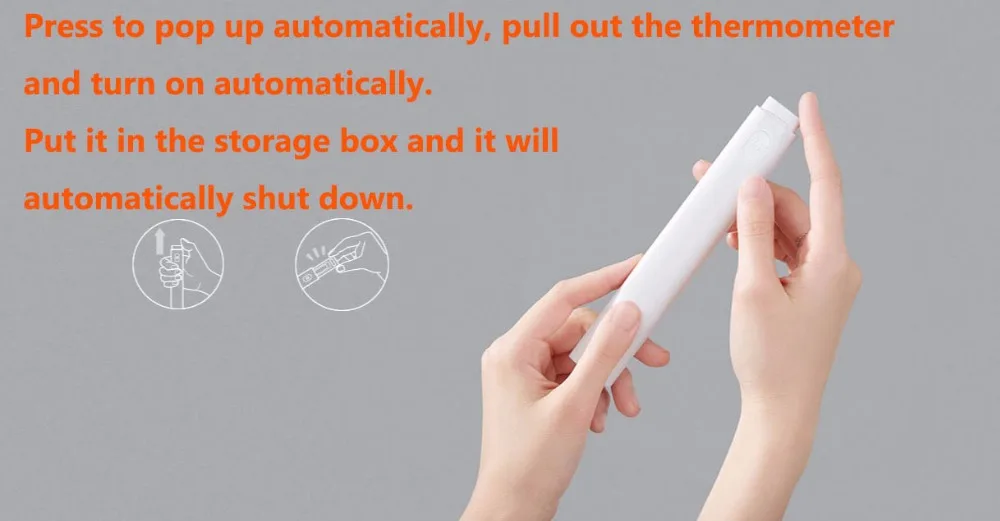 Нажмите, чтобы всплыть автоматически, вытяните термометр и включите автоматически. Поместите его в ящик для хранения, и он автоматически отключится.