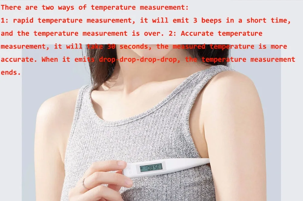 Существует два способа измерения температуры: 1: Быстрое измерение температуры, он испускает 3 звука за короткое время, и измерение температуры закончено. 2: точное измерение температуры, это займет 30 секунд, измеренная температура более точная. Когда он испускает падение-падение, измерение температуры заканчивается.