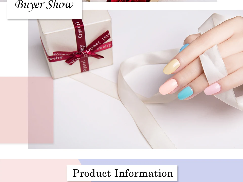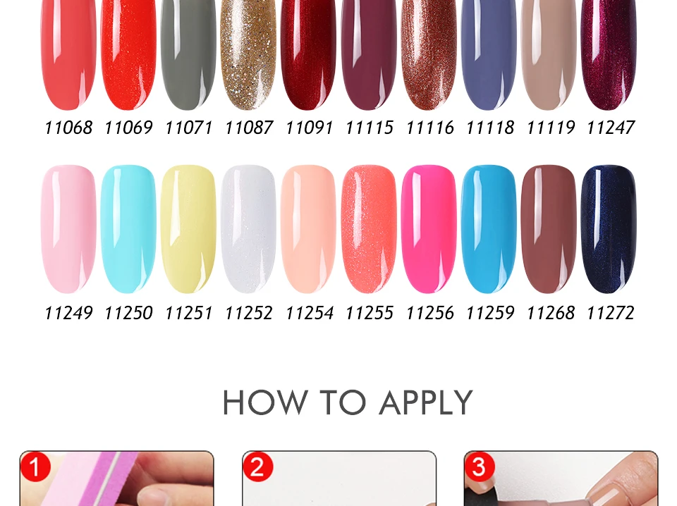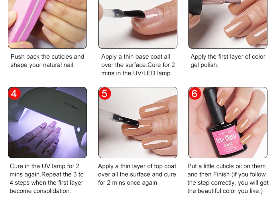 Шаги:1. Стирайте руки и полируйте поверхность ногтей.2. Почистите базовый слой, отвердите 1-2 минуты УФ-лампа.3. Кисть для цветных гелевых ногтей, Отверждение 2 мин.4. Нанесите еще один слой цвета, отвердите 2 минуты.5. Расчесывайте верхнее пальто, Лечение 3 мин.6. Протрите поверхность ногтя моющим средством, чтобы получить идеальный блеск.Если светодиодная лампа, время отверждения должно быть 30-60 секунд в раз.