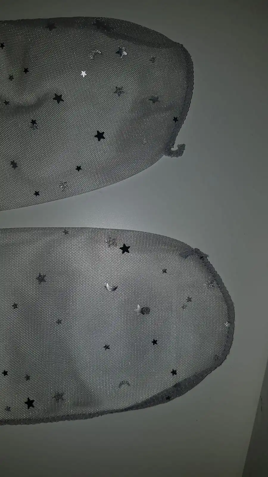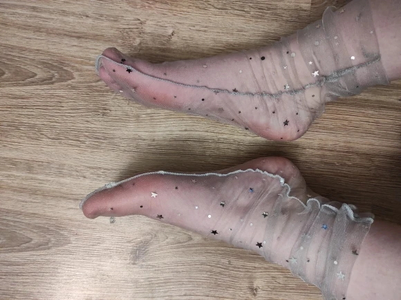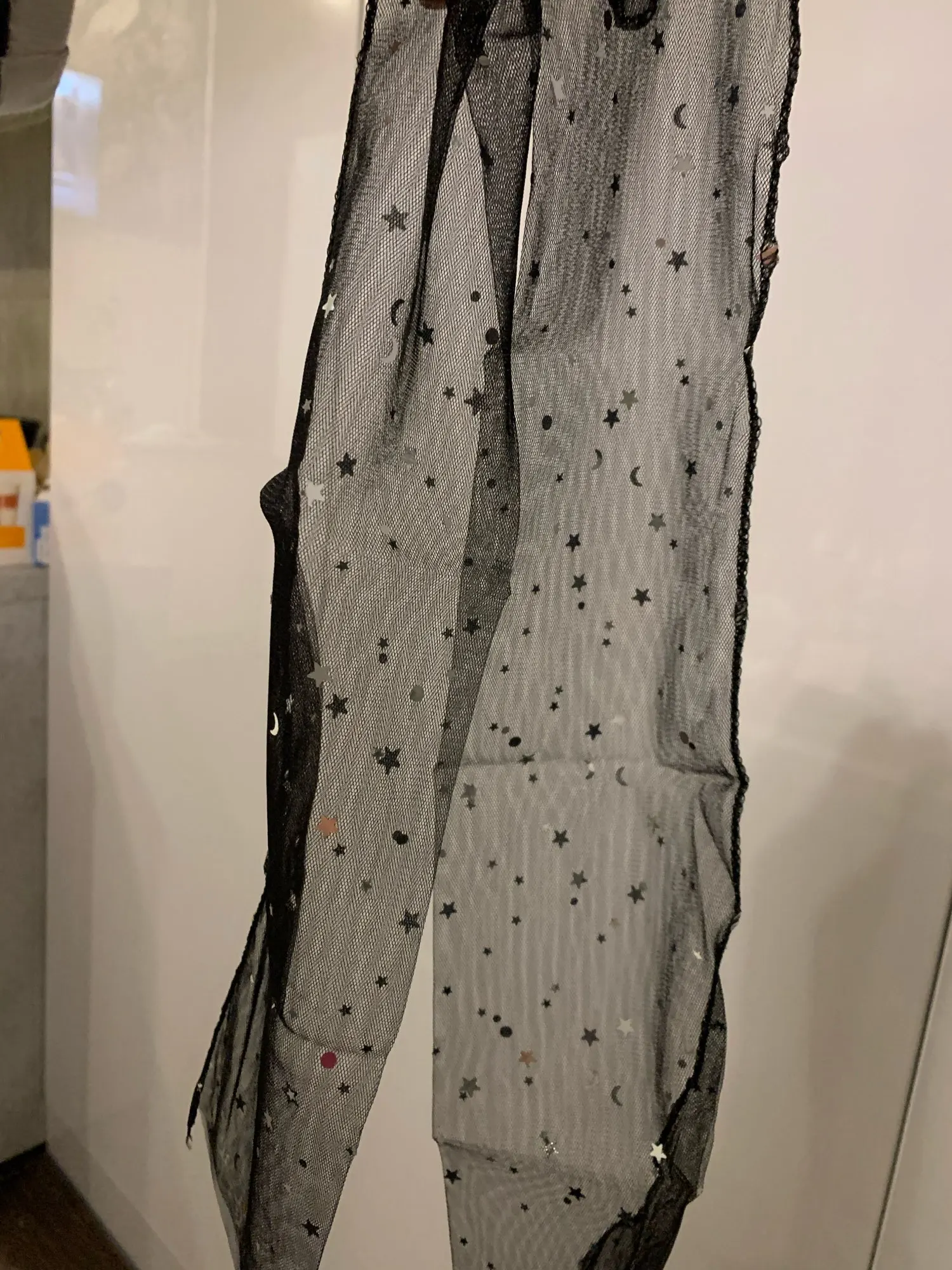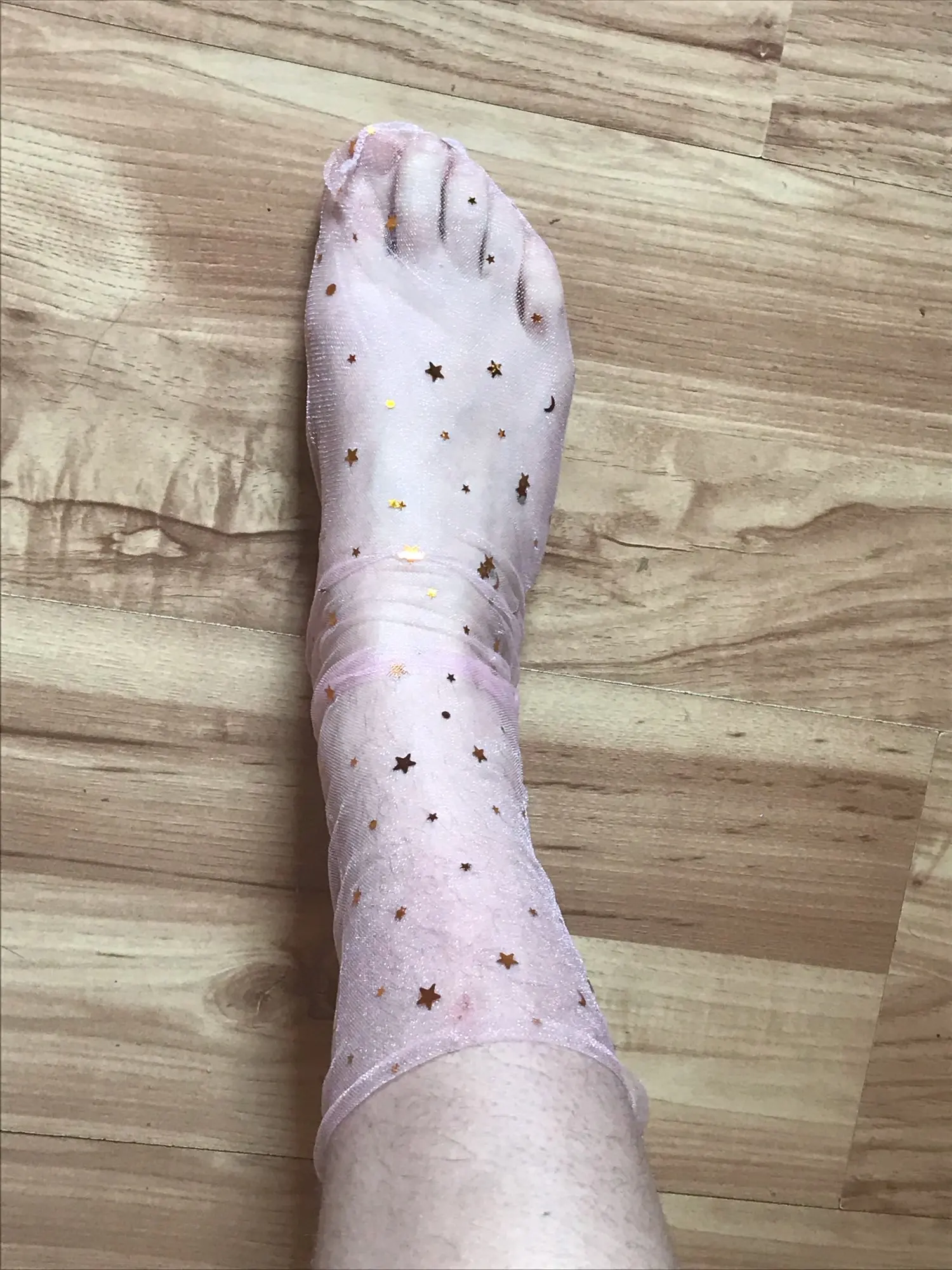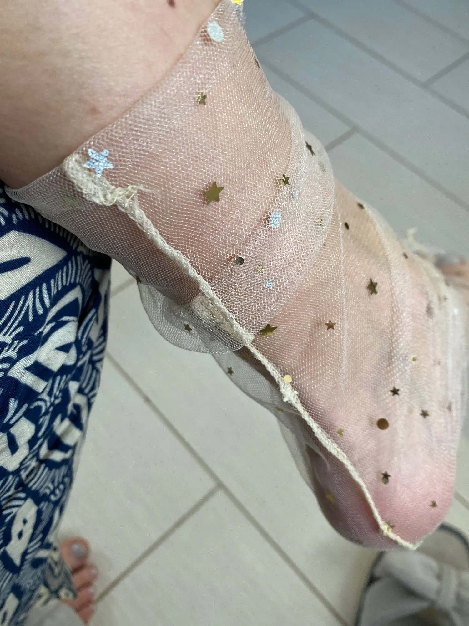 Носки милые и красивые. Вначале была удивлена, что они длиннее, чем я предполагала. Но после того, как примерила, убедилась, что все выглядит отлично. Ткань тонкая сетка, сверху приклеены золотистые звездочки. Цвет в точности, как на картинке