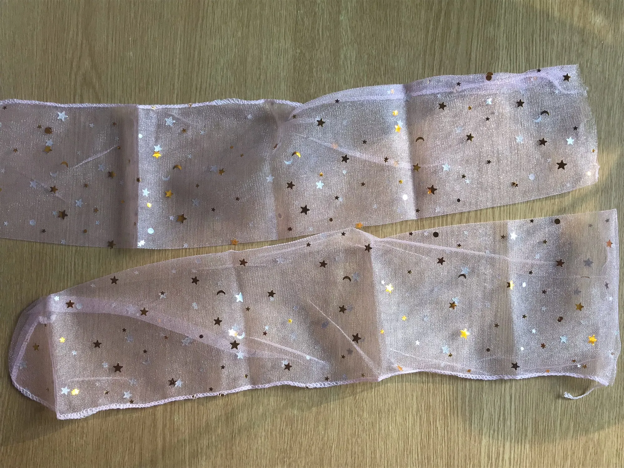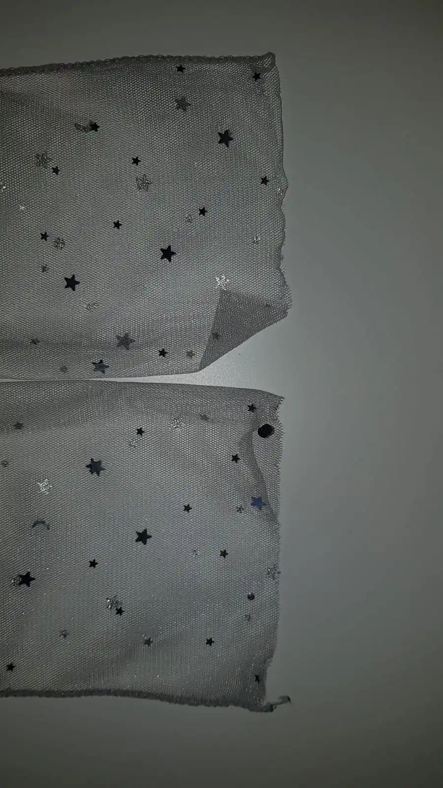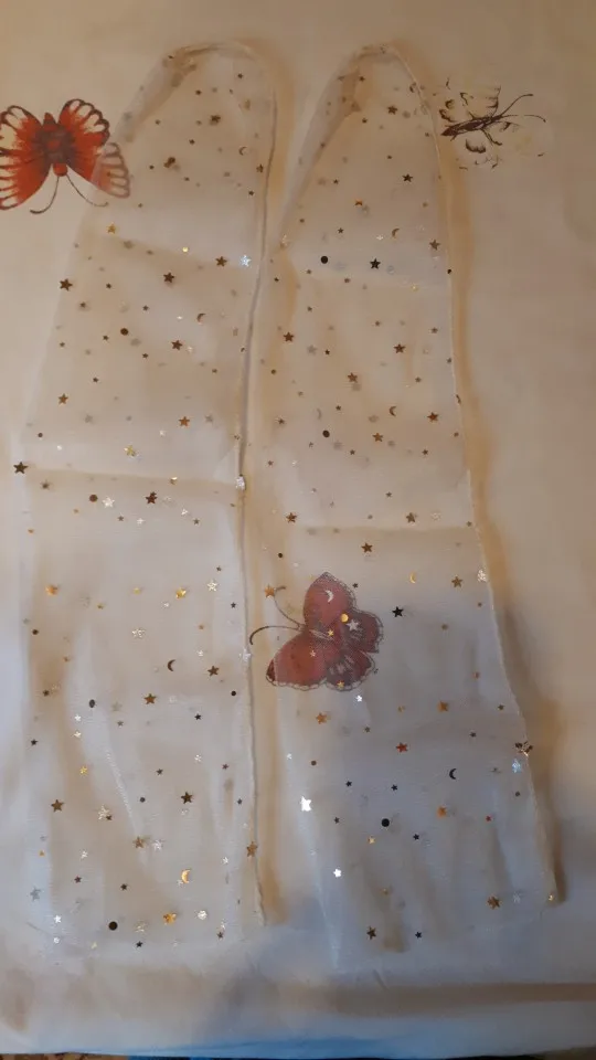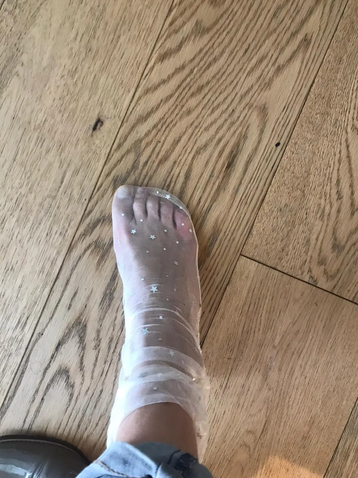 Носки милые и красивые. Вначале была удивлена, что они длиннее, чем я предполагала. Но после того, как примерила, убедилась, что все выглядит отлично. Ткань тонкая сетка, сверху приклеены золотистые звездочки. Цвет в точности, как на картинке
