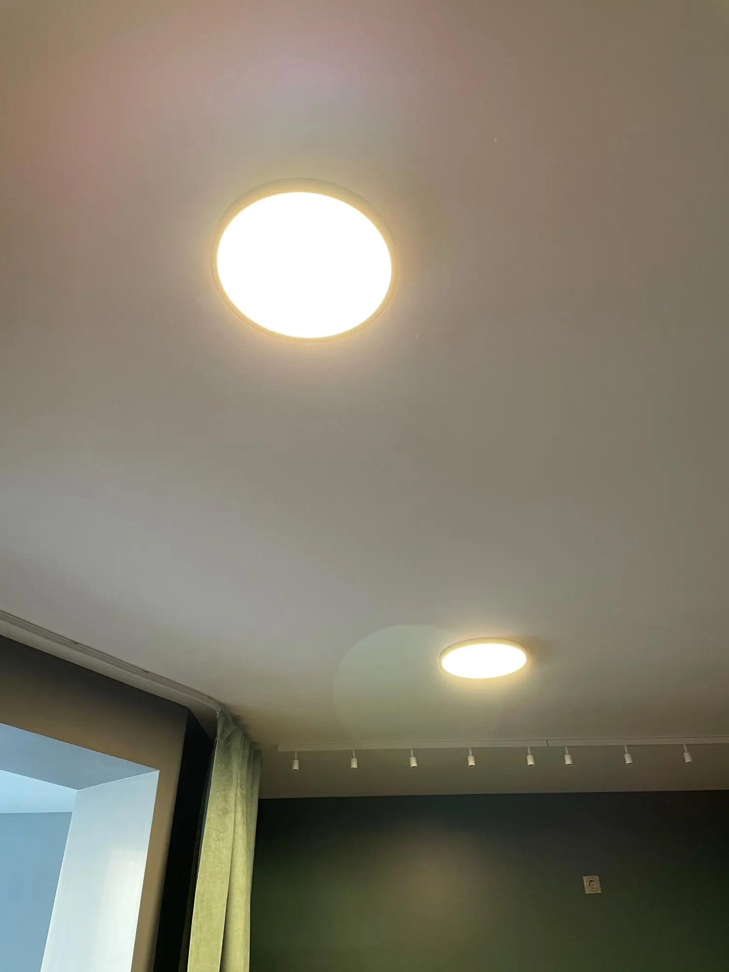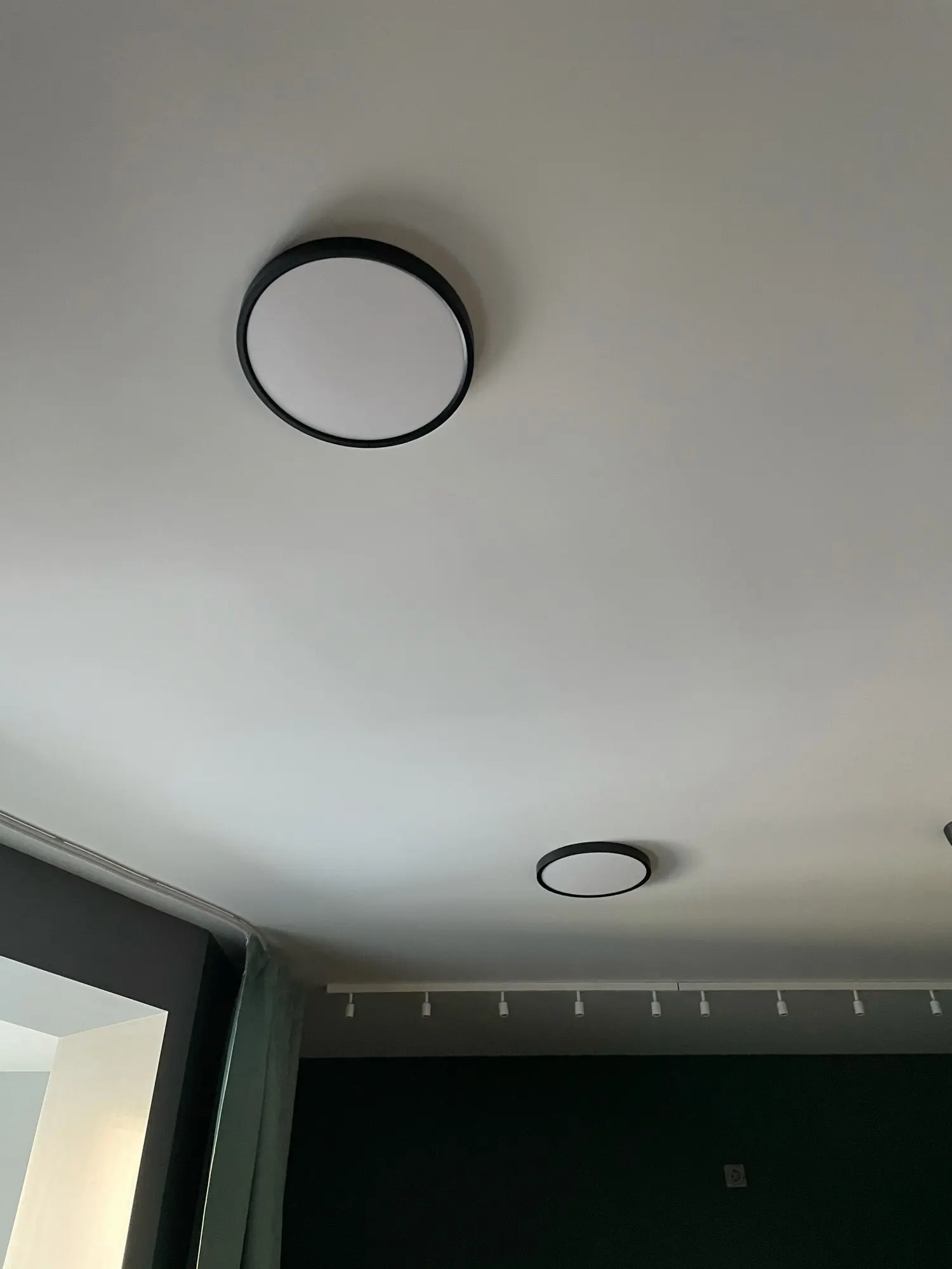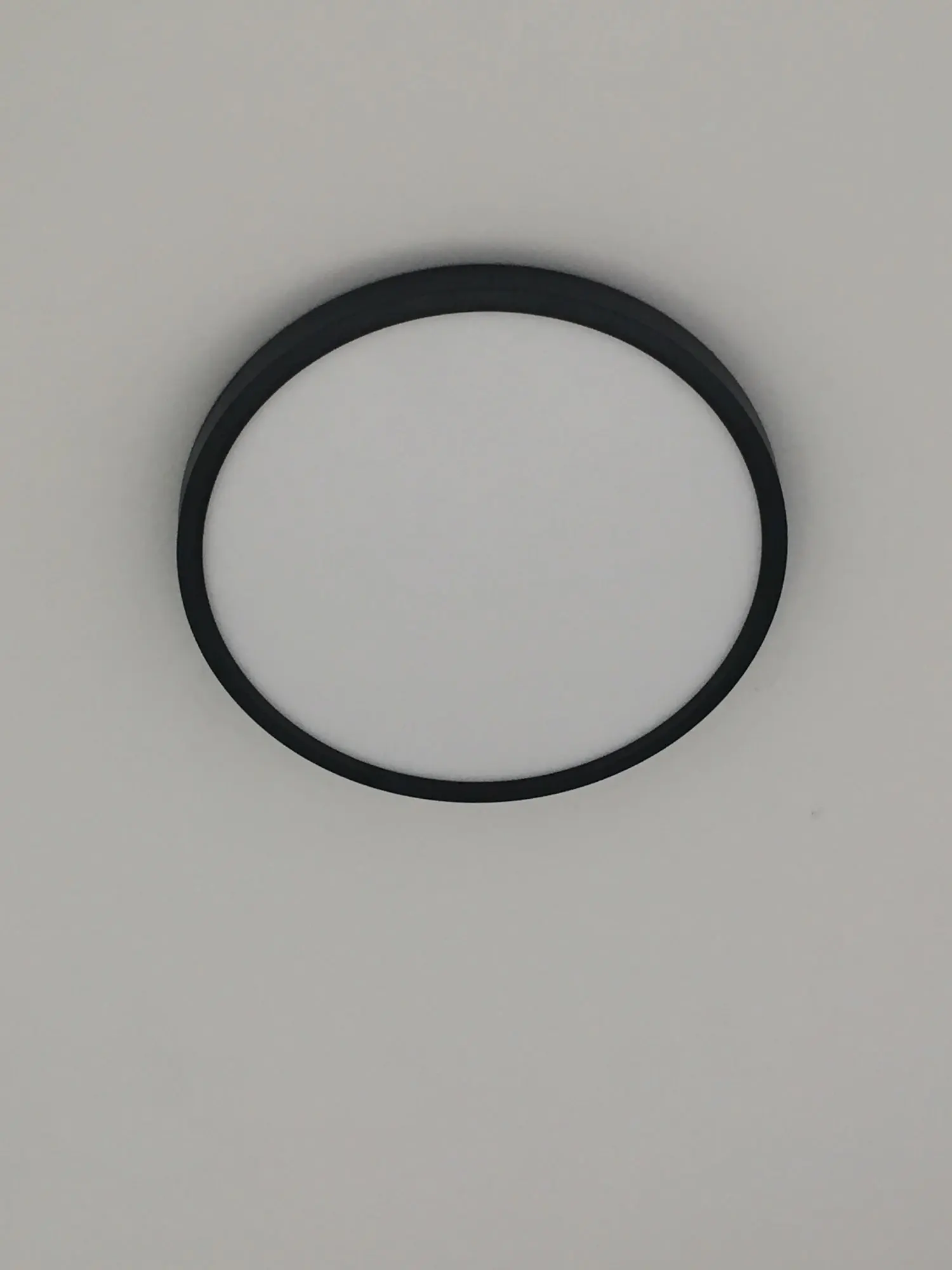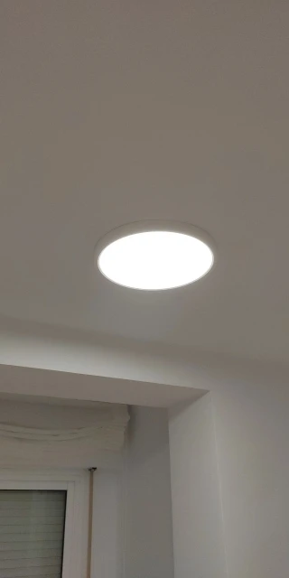Действительно очень тонкий и плотно прилегает к потолку. Потолок остаётся тёмным, так как есть окантовка на светильнике.