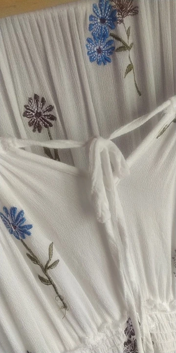 Супер! Деликатный материал, настоящая вышивка, классная вышивка. Идеально подходит для летних вечеров. У меня есть Размеры 93x76x100 см, ③ L и идеально. При росте 173 см до середины икры. Доставка в течение 2,5 недель. Рекомендуется.